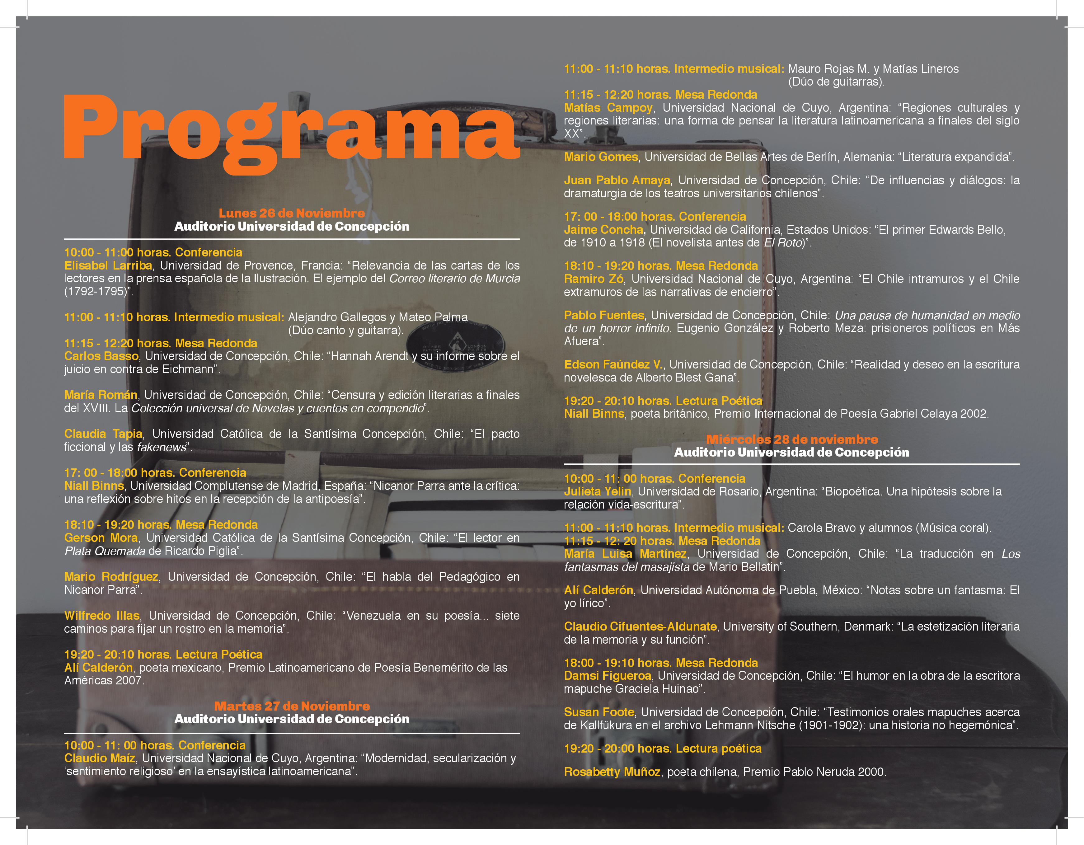 También expondrá sobre Nicanor Parra el profesor emérito de la UdeC Mario Rodríguez, y además de ello habrá ponencias y mesas redondas en las cuales se tocarán todo tipo de problemas relativos a la literatura, por parte de investigadores provenientes de países como Francia, Estados Unidos, México, Dinamarca, Argentina. Junto a ellos participarán académicos de las Universidades de Concepción y Católica de la Santísima Concepción.