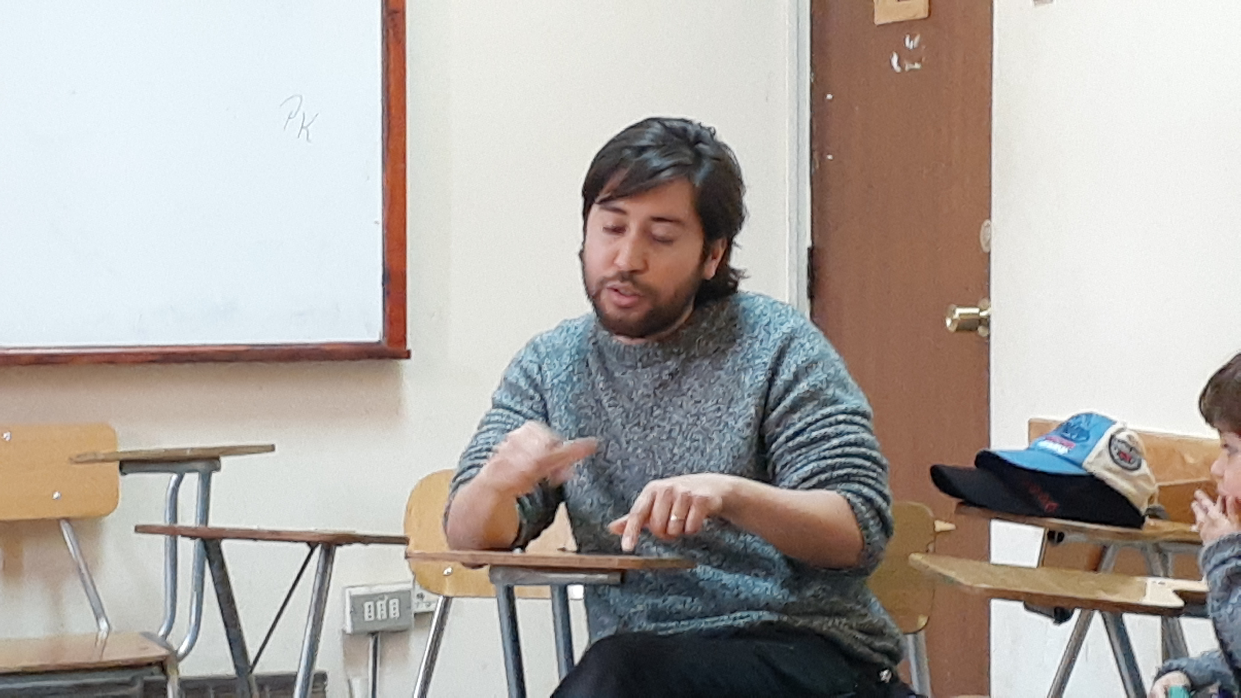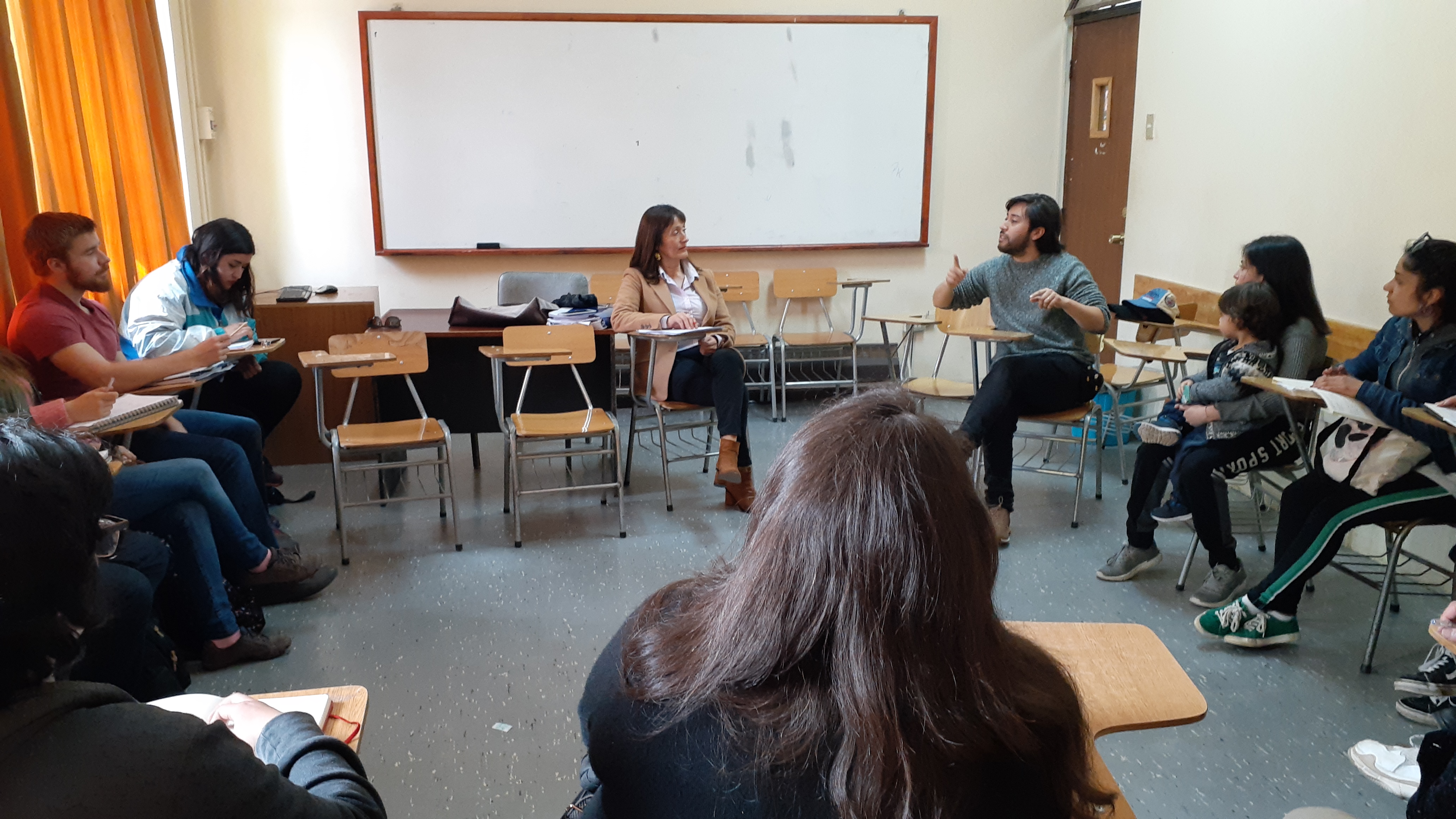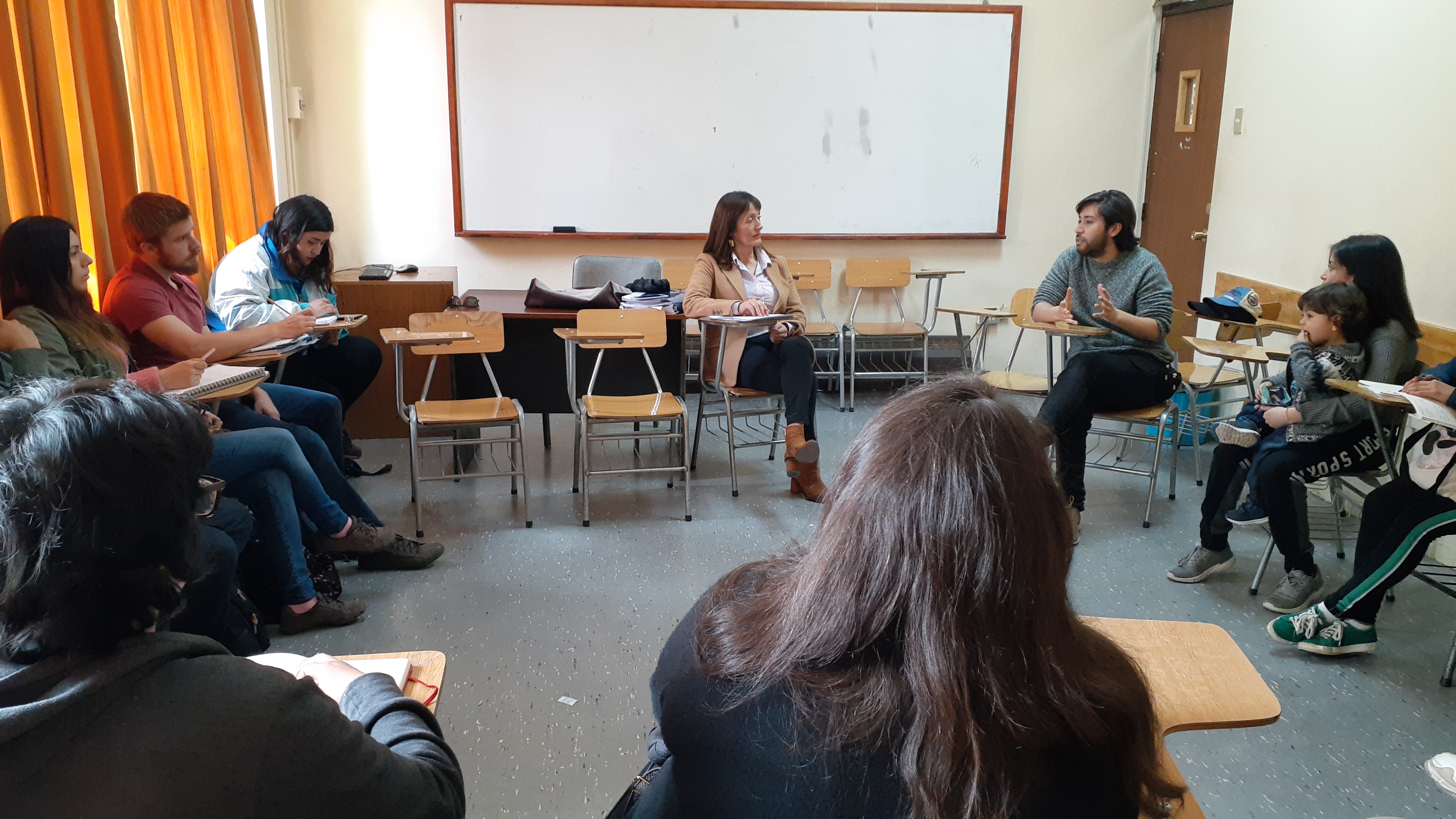 El Departamento de Español invitó a dos integrantes de la compañía teatral penquista La Otra Zapatilla, Oscar Cifuentes y Jenifer Salas para conversar con los alumnos de la asignatura «Temas y Problemas del Teatro Chileno», sobre el proceso de creación.