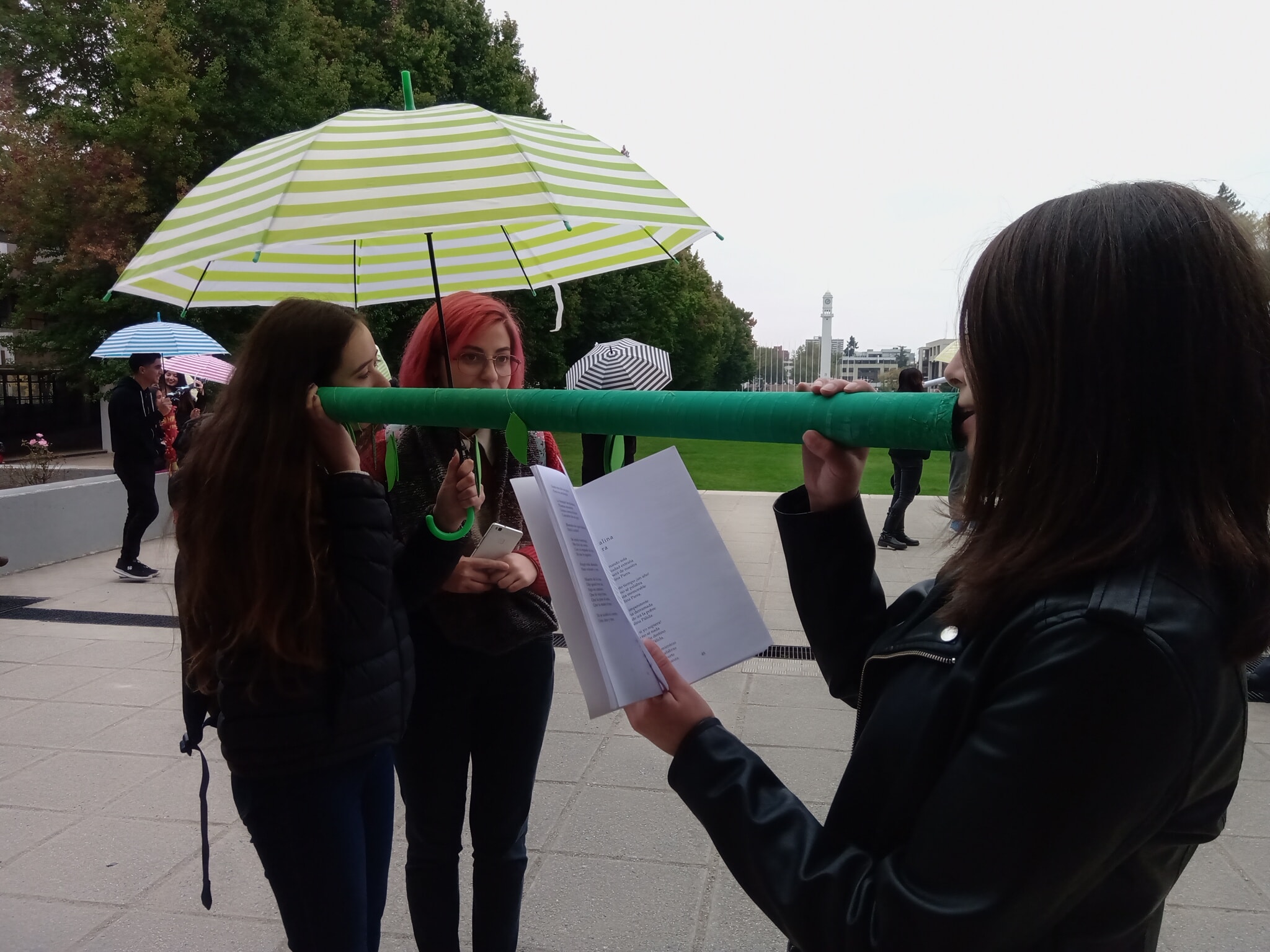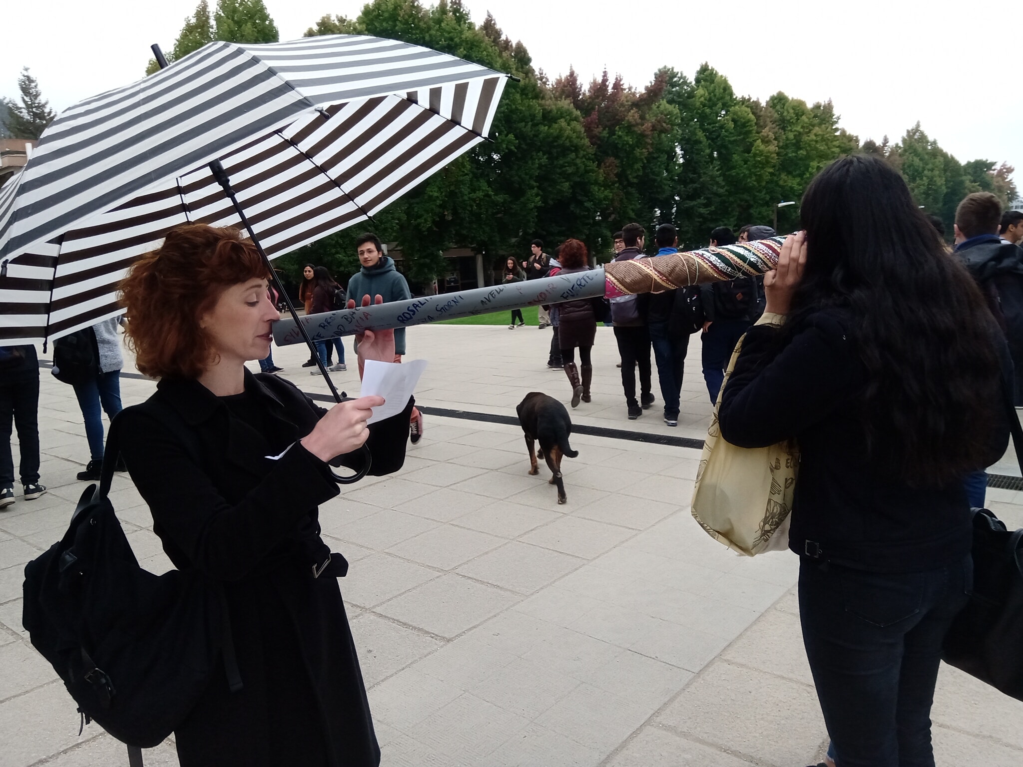 Se trató de una intervención artística denominada “Susurradores Literarios”, protagonizada por 15 estudiantes del curso “Literatura e Intermedialidad” de Pedagogía en Español de la Facultad de Educación, bajo la coordinación de la profesora María Román López. «El trabajo colectivo y el entusiasmo por la literatura son los elementos que han caracterizado esta actividad. Fue pensada para promocionar el libro y la lectura más allá del aula, en un espacio común y compartido por toda la comunidad universitaria”, indicó la profesora María Román.