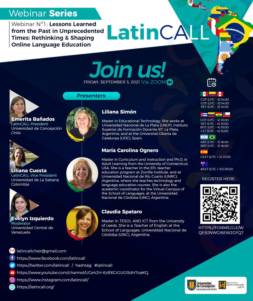 La Asociación internacional Latino Americana de Aprendizaje de Idiomas Extranjeros (LatinCALL), cuya sede está en la Universidad de Concepción, Facultad de Humanidades y Artes, y es presidida por la docente Emerita Bañados del Depto. de Idiomas Extranjeros, informa que este viernes 3 de septiembre, a las 15 horas Stgo.-Chile, realizará vía Zoom REUNA, el primero, de una serie de Webinars, dirigidos a la comunidad nacional e internacional de profesores de lenguas extranjeras. LatinCALL tiene miembros de diversos países, tales como Colombia, Argentina, España, Estados Unidos, Australia, Cuba, Venezuela, Bélgica, Chile, entre otros.