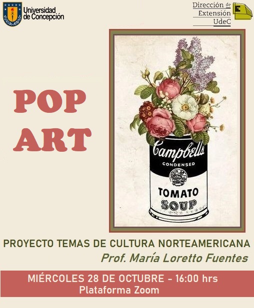 Se informa que este miércoles 28 de octubre se realizará la cuarta charla mediante modalidad on-line, denominada «POP ART», la cual forma parte del proyecto de extensión UdeC-2°Semestre, dirigido por la profesora del Departamento de Idiomas Extranjeros, María Loreto Fuentes, y cuenta con la colaboración de Fernando Silva, docente del Instituto Chileno Norteamericano de Cultura de Concepción (ICNC) y Alumnus UdeC,.y Yasna Pereira Reyes, Docente del Dpto. Idiomas Extranjeros de la UdeC.