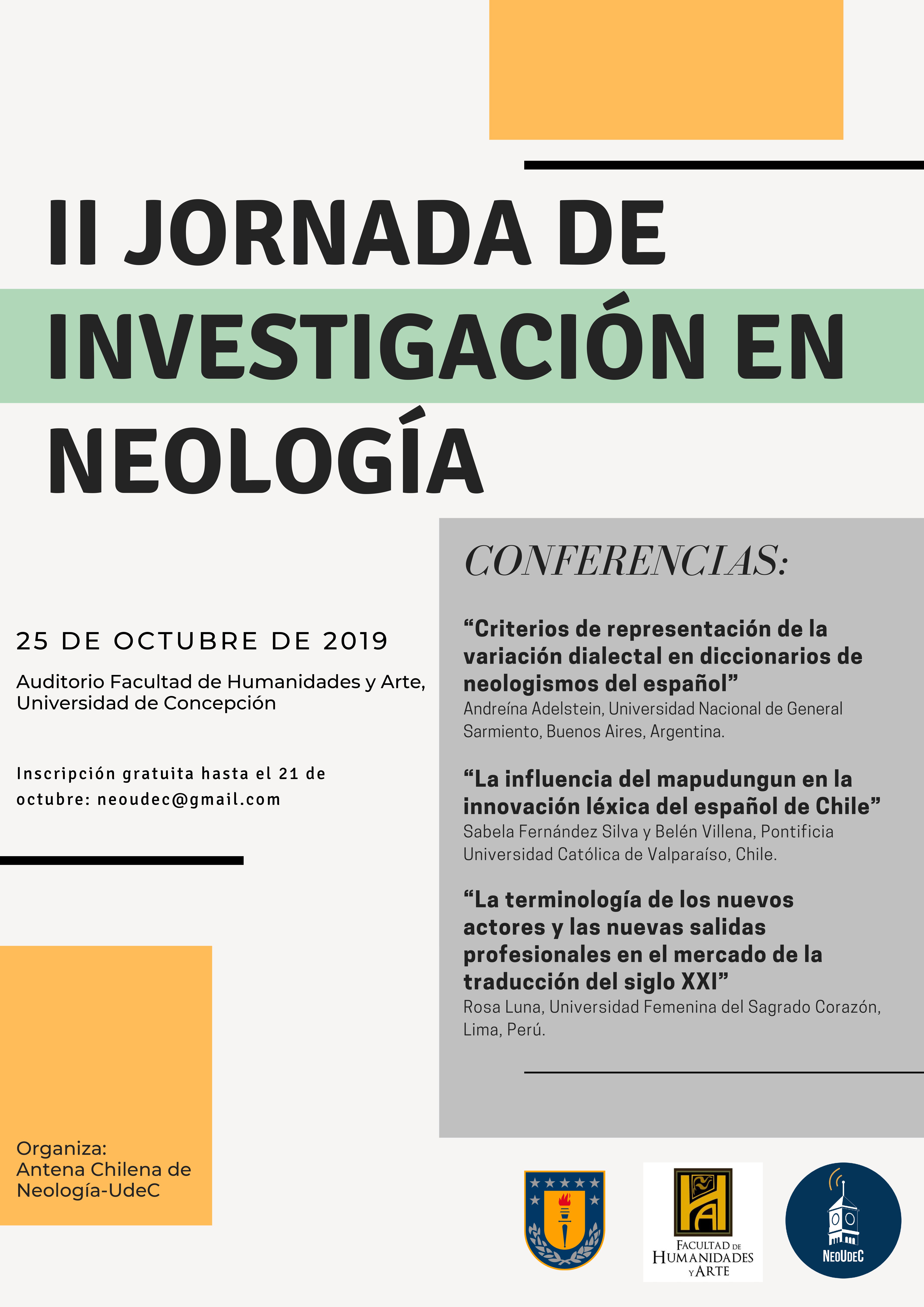 Se informa que este 25 de octubre se llevará a cabo la II Jornada de Investigación en Neología, en el Auditorio de la Facultad de Humanidades y Arte de la Universidad de Concepción.