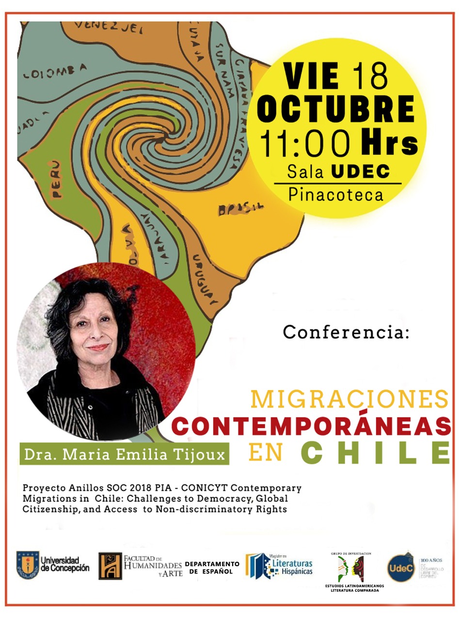 El Grupo de Investigación Estudios Latinoamericanos en Literatura Comparada del Departamento de Español, en el marco de las actividades del Centenario de la UdeC, invita a toda la comunidad a asistir a la conferencia Migraciones Contemporáneas en Chile, de la Dra. María Emilia Tijoux, Coordinadora Académica de la Cátedra Racismos y Migraciones Contemporáneas de la Universidad de Chile y como Directora del proyecto Anillos SOC2018 PIA – CONICYT Contemporary Migrations in Chile: Challenges to Democracy, Global Citizenship, and Access to Non-discriminatory Rights.