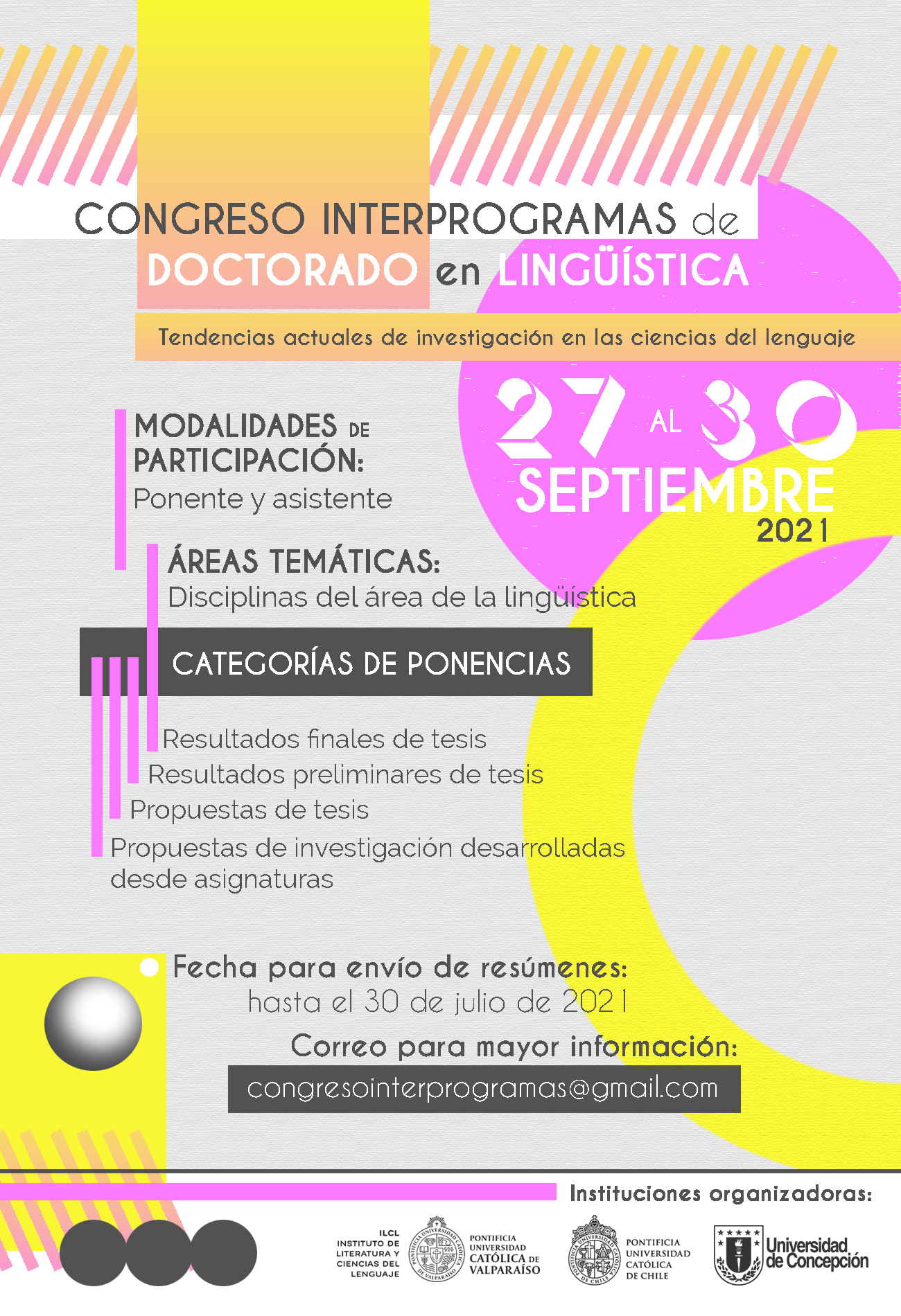 Las y los estudiantes de los programas de Doctorado en Lingüística de las universidades Pontificia Universidad Católica de Valparaíso, Pontificia Universidad Católica de Chile y Universidad de Concepción, invitan al Congreso interprogramas de Doctorado en Lingüística: tendencias actuales de investigación en las ciencias del lenguaje, versión 2021. En esta ocasión deseamos favorecer la discusión e intercambiar experiencias, reflexiones, problemáticas y resultados de investigaciones en torno a diversos ejes temáticos del campo lingüístico.