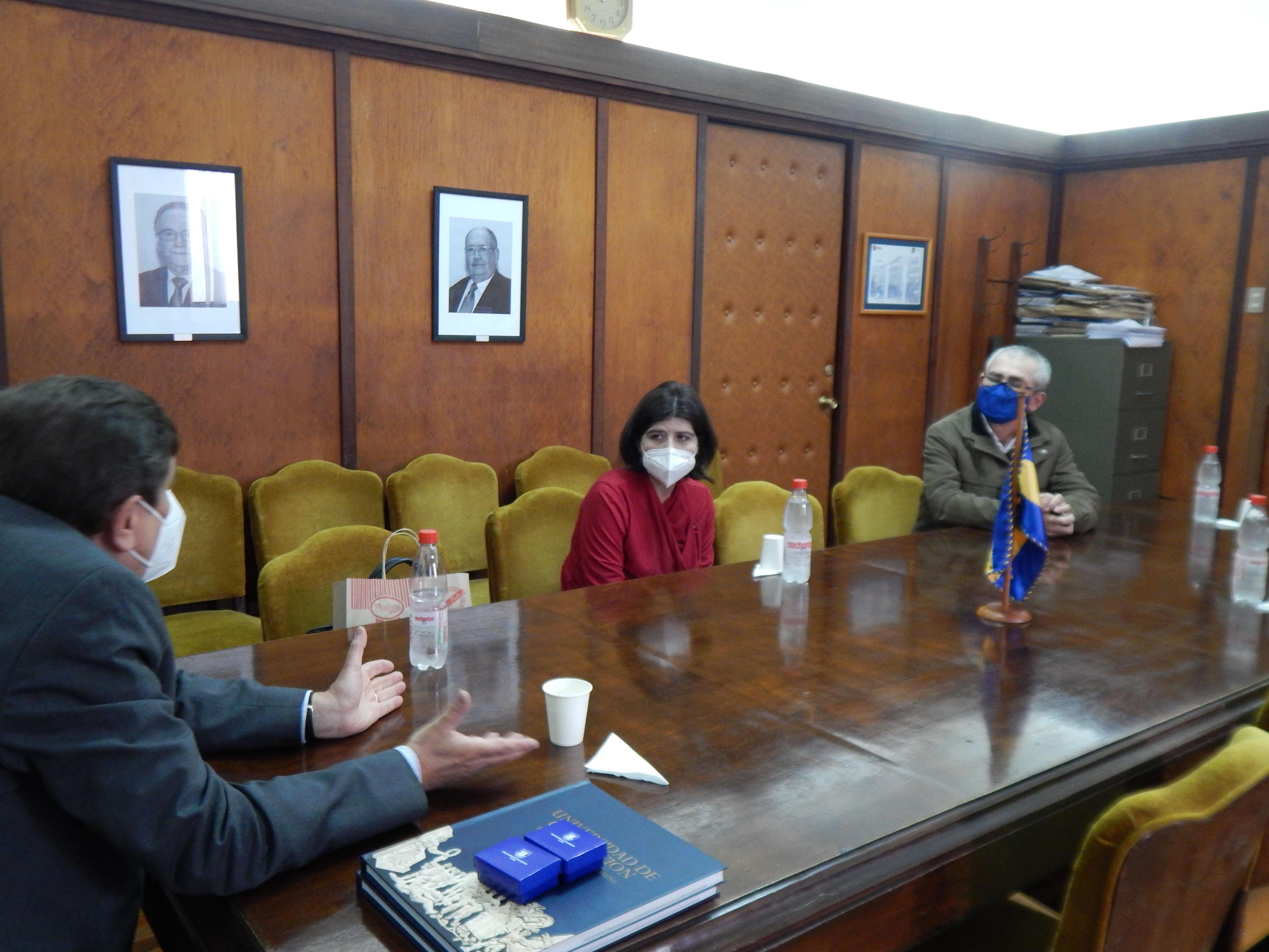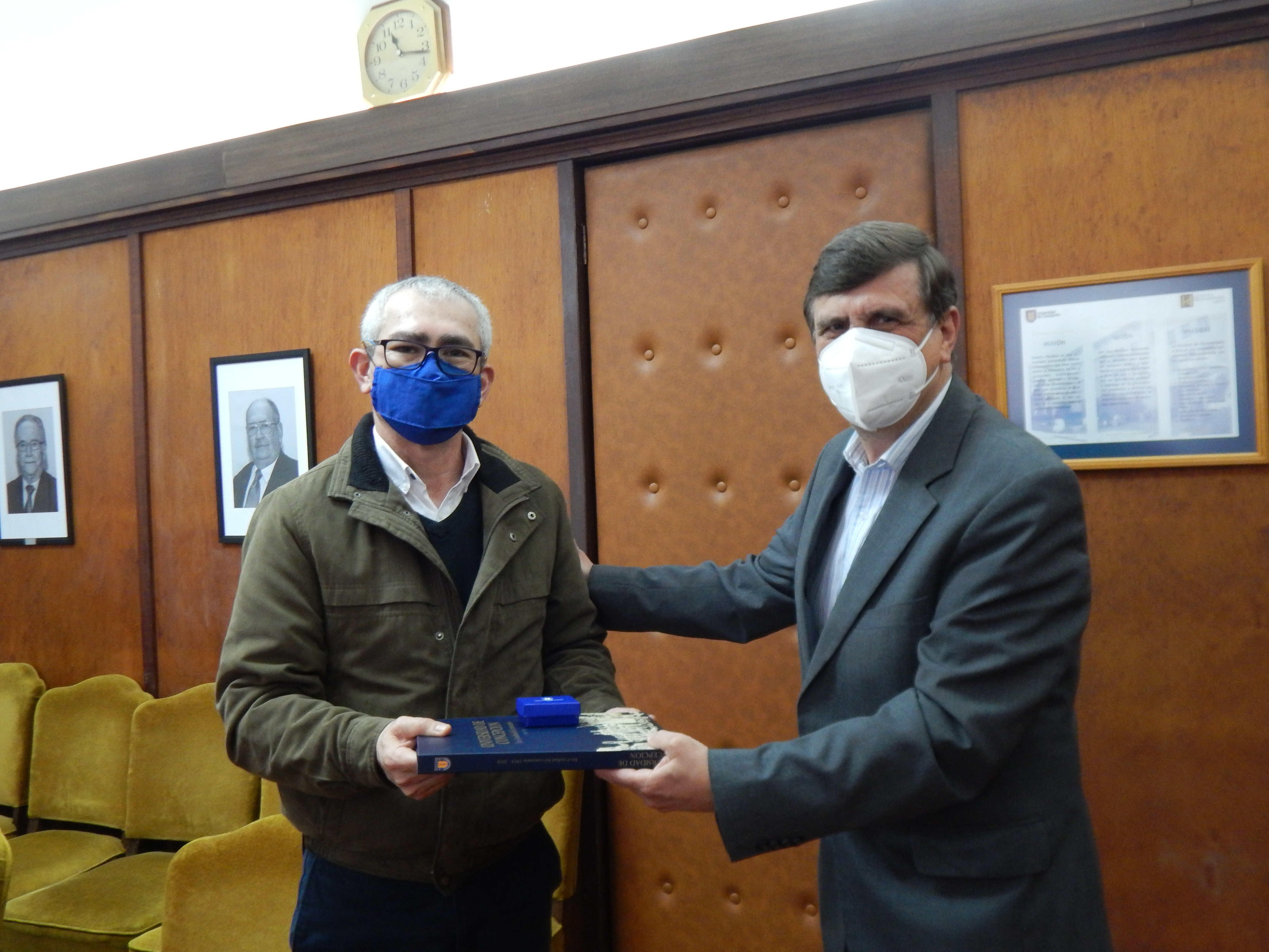 Además, en la cita el Dr. Bancalari entregó como presente a ambos académicos sendos ejemplares del libro “Universidad de Concepción, En el umbral del Centenario”, junto con la piocha institucional.