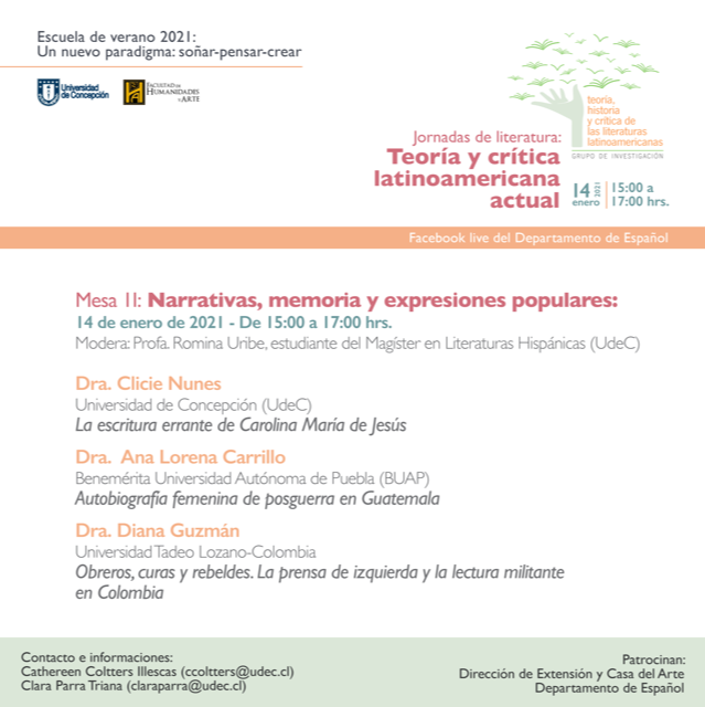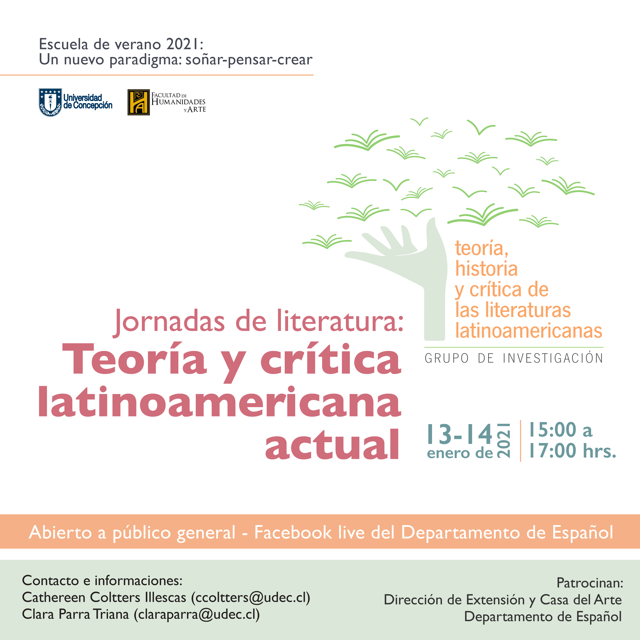 El Departamento de Español informa que entre este miércoles 13 y jueves 14 de enero se llevarán a cabo las «Jornadas de literatura: teoría y crítica latinoamericana actual», las cuales son organizadas por las doctoras, Cathereen Coltters y Clara Parra.