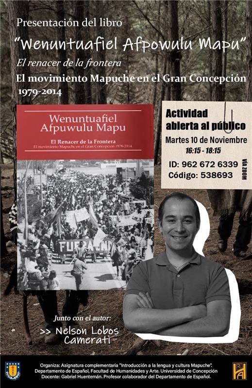 El Departamento de Español informa que este martes 10 de noviembre se realizará la presentación del libro titulado «El renacer de la frontera. El movimiento Mapuche en el Gran Concepción 1979-2014», del abogado Nelson Lobos Camerati.