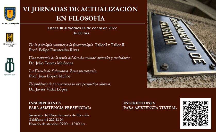 - Para asistir presencialmente debe inscribirse llamando telefónicamente a la secretaria del Departamento de Filosofía.