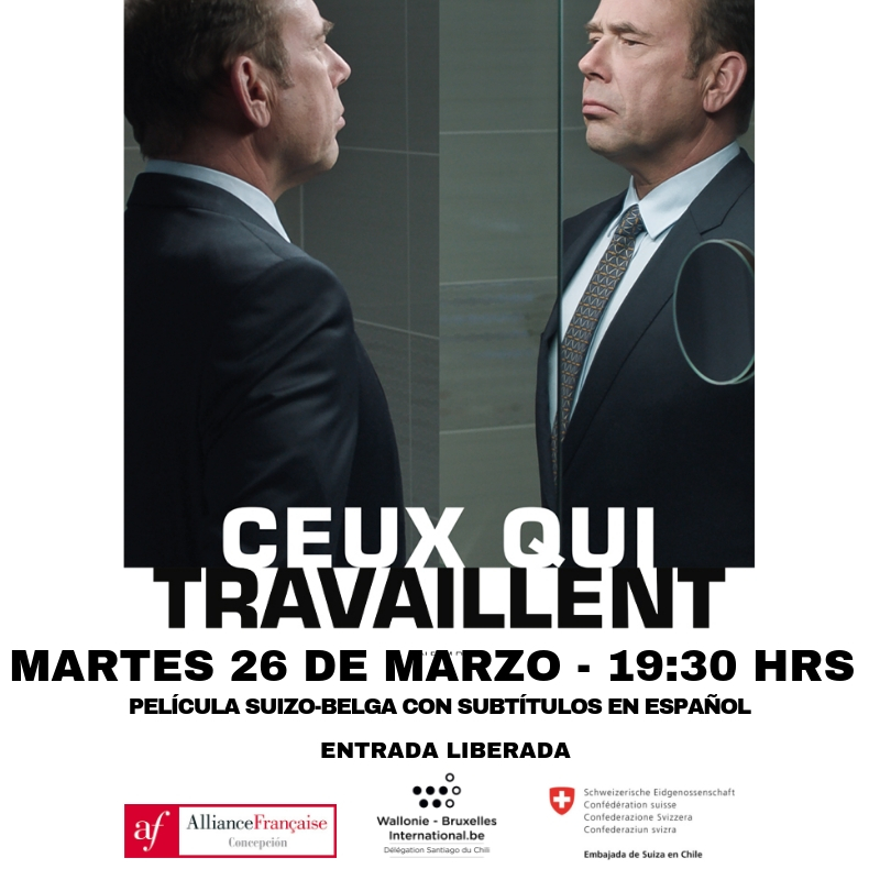 El martes 26 de marzo a las 19:30 horas, se exhibirá la coproducción cinematográfica belga-suiza “Ceux qui travaillent” de Antoine Russbachen en la sala de teatro de la Alianza Francesa. Trata de la historia de Frank, un ejecutivo superior en una gran empresa de transporte marítimo que dedicó toda su vida al trabajo. Mientras se enfrenta a una crisis en un carguero, Frank, solo y apurado, toma una decisión que le cuesta su trabajo. Profundamente conmocionado, traicionado por un sistema al que dio todo, se encuentra cuestionando toda su vida. Una presentación de la película estará organizada previamente a la función por la Agregada cultural de Valonia-Bruselas Internacional y la Consulesa Honoraria de Suiza.