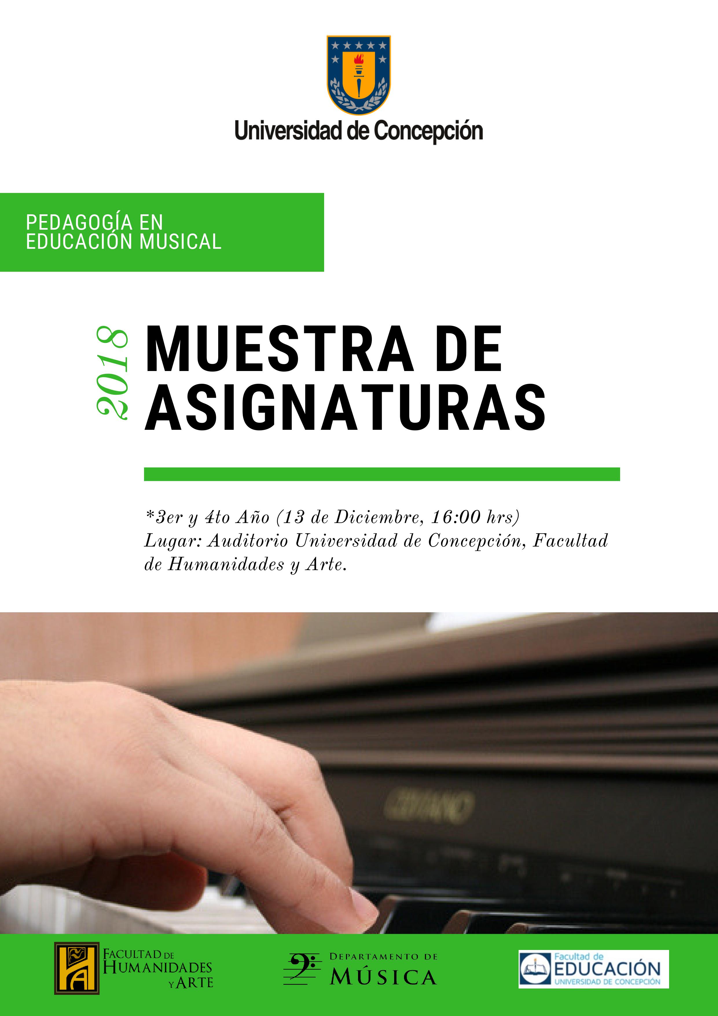 El Departamento de Música de la Facultad de Humanidades y Arte de la UdeC, invita a toda la comunidad académica y estudiantil a la Muestra de Asignaturas 2018, la cual se realizará este jueves 13 de diciembre a las 16.00 horas en el Auditorio UdeC de nuestra Facultad.