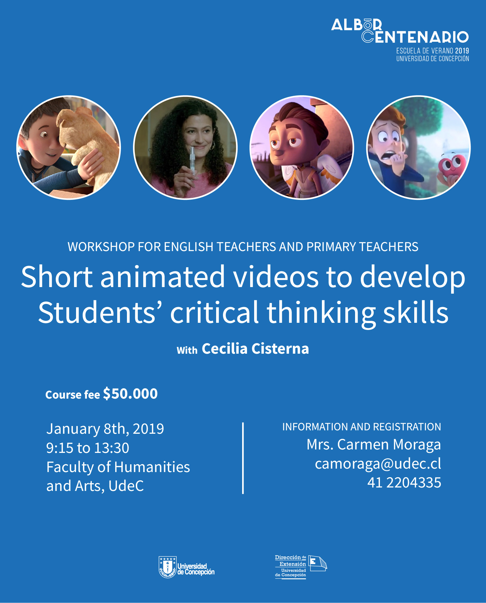El Departamento de Idiomas Extranjeros informa que este martes 8 de enero se realizará el workshop «Short animated videos to developed Student´s critical thinking skills», el cual está dirigido a profesores de inglés y de establecimientos de educación básica.