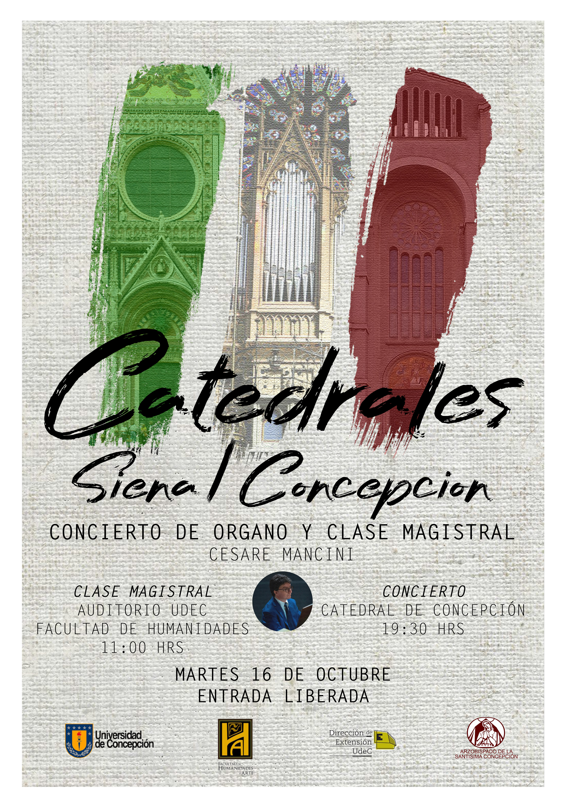 El evento se realizará el martes de 16 de octubre, y consiste en una Clase Magistral a las 11.00 horas en el Auditorio UdeC de la Facultad de Humanidades y Arte. Posteriormente, ese mismo día, a las 19.30 horas se llevará a cabo un concierto de órgano en la Catedral de Concepción, cuyo programa musical está relacionado con las peculiaridades históricas y constructivas, y en el que destacan: Bach, como la referencia universal de la literatura por órgano; el Bossi italiano, como un tributo a los orígenes del creador de órganos Oreste Carlini; Franck, como el principal autor de la era romántica; Vierne, como estudiante y heredero ideal de Franck y el máximo representante de la generación siguiente a la de su maestro.