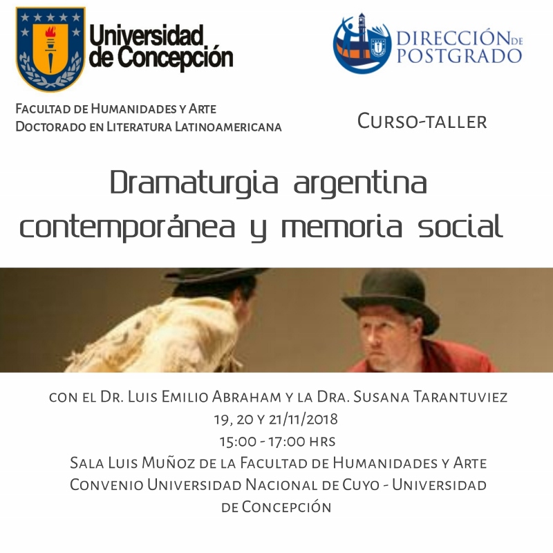 El Programa de Doctorado en Literatura Latinoamericana de la Facultad de Humanidades y Arte de la UdeC, invita a participar del próximo Curso-Taller sobre Dramaturgia Argentina Contemporánea y Memoria Social, el cual forma parte de un convenio académico e institucional suscrito entre la Universidad Nacional de Cuyo de Argentina y la Universidad de Concepción.