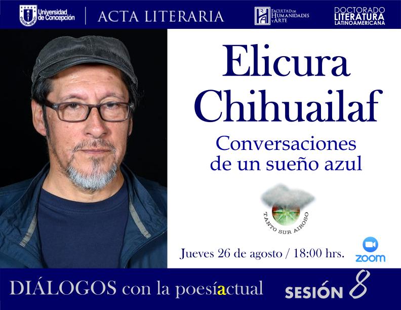 Diálogos con la poesía actual contará, en su octava sesión, con la presencia del oralitor, poeta, traductor y ensayista mapuche Elicura Chihuailaf, quien ofrecerá una lectura de su poesía y conversará con los asistentes. Elicura Chihuailaf ha publicado, entre otros libros, El invierno y su imagen (1977), En el país de la memoria (1988), De sueños azules y contrasueños (1995), Recado confidencial a los chilenos (1999), Sueños de luna azul (2009), Ruegos y nieves en el azul (2014), La vida es una nube azul (2015), Sueños de luna azul y otros cantos (2018) y El azul del tiempo que nos sueña (2020). Ha recibido, entre otros importantes reconocimientos, el Premio Municipal de Poesía, Santiago, 1997; el Premio Nacional de Poesía Jorge Teillier, 2014; el Premio Luis Oyarzún, 2016; y el Premio Nacional de Literatura de Chile, 2020.
