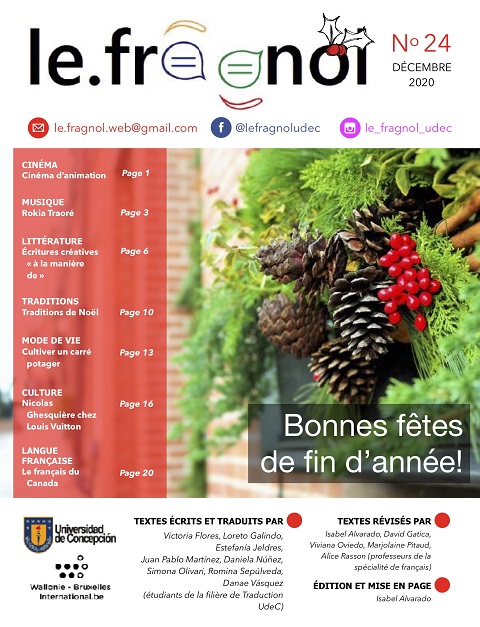 Le Fragnol es una revista escrita por estudiantes de francés de la carrera de Traducción/Interpretación en Idiomas Extranjeros de nuestra Facultad. Un equipo de profesores de la especialidad de francés del Departamento de Idiomas extranjeroslas/los acompaña en el proceso de revisión y corrección de sus artículos. El equipo de Le Fragnol quisiera destacar y valorar el trabajo y el compromiso de los estudiantes quienes, con sus pasiones e ideas, le dan vida y color a la revista. Sin ellos este proyecto no podría existir.