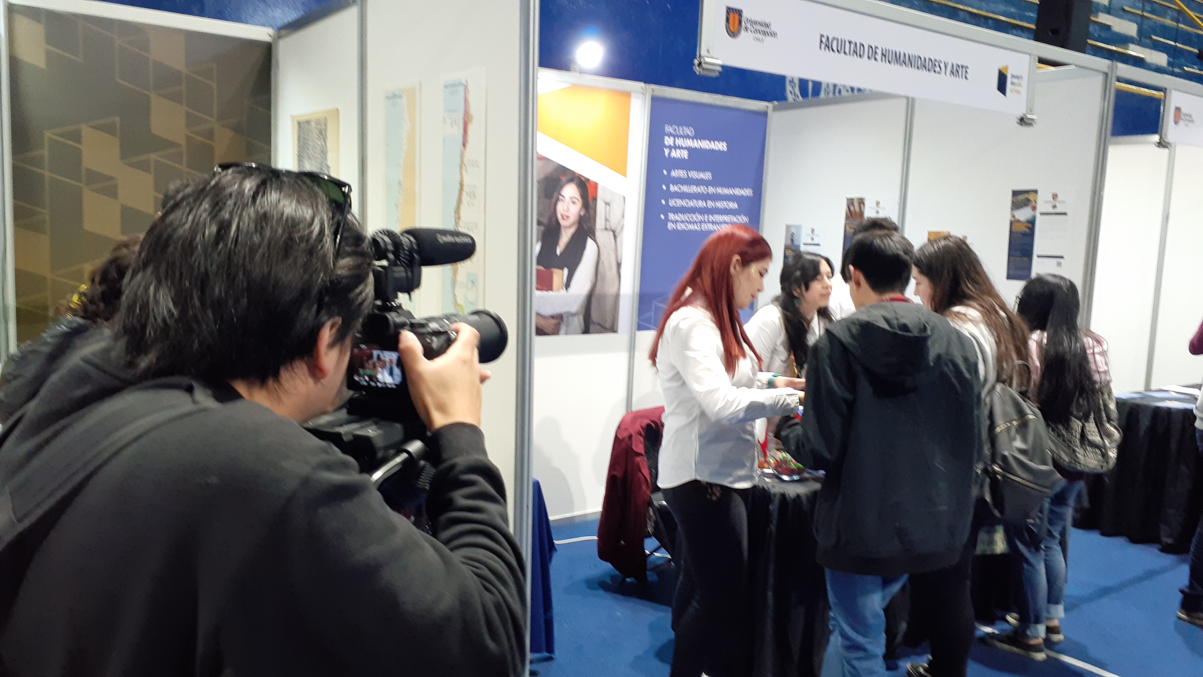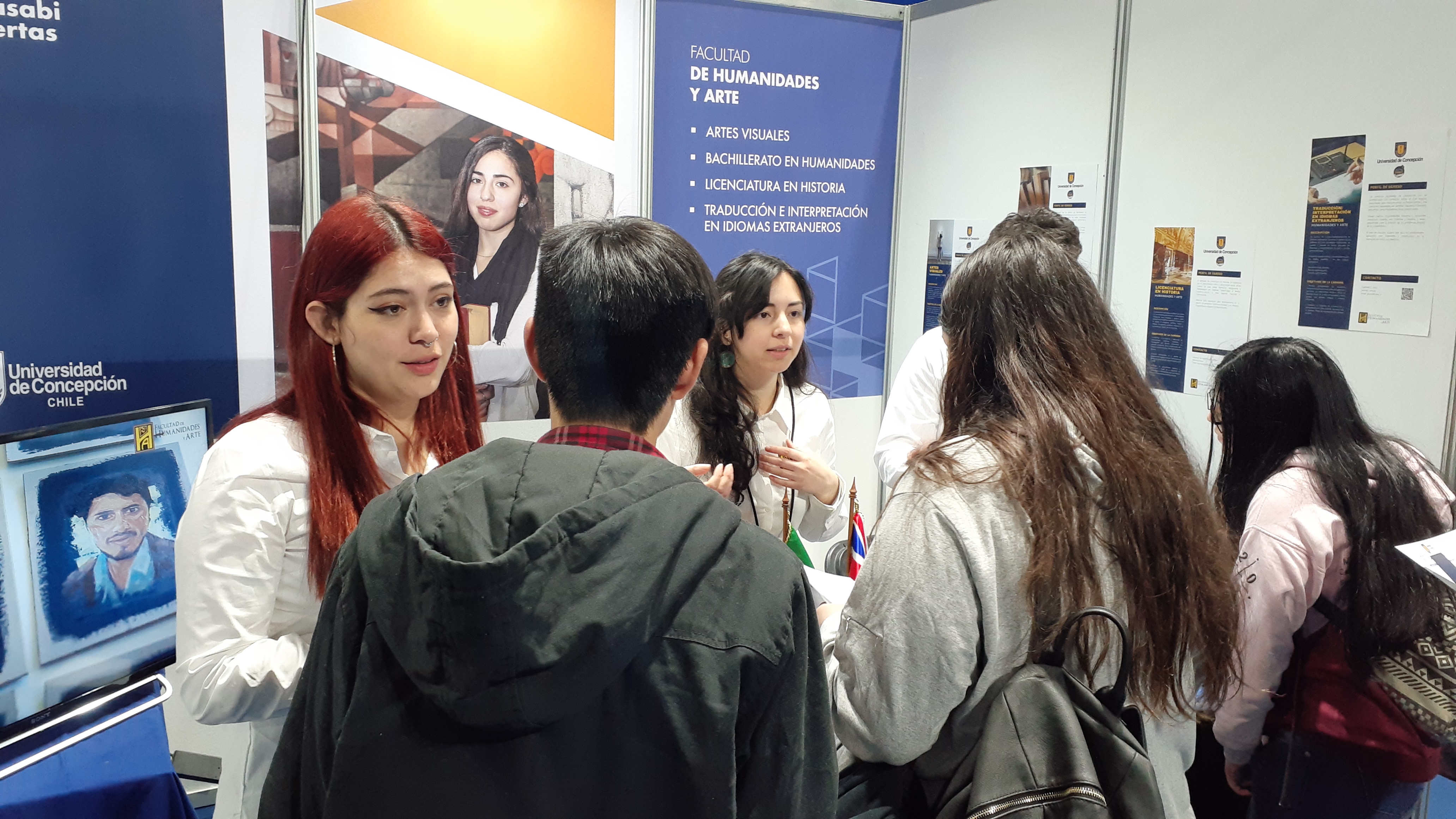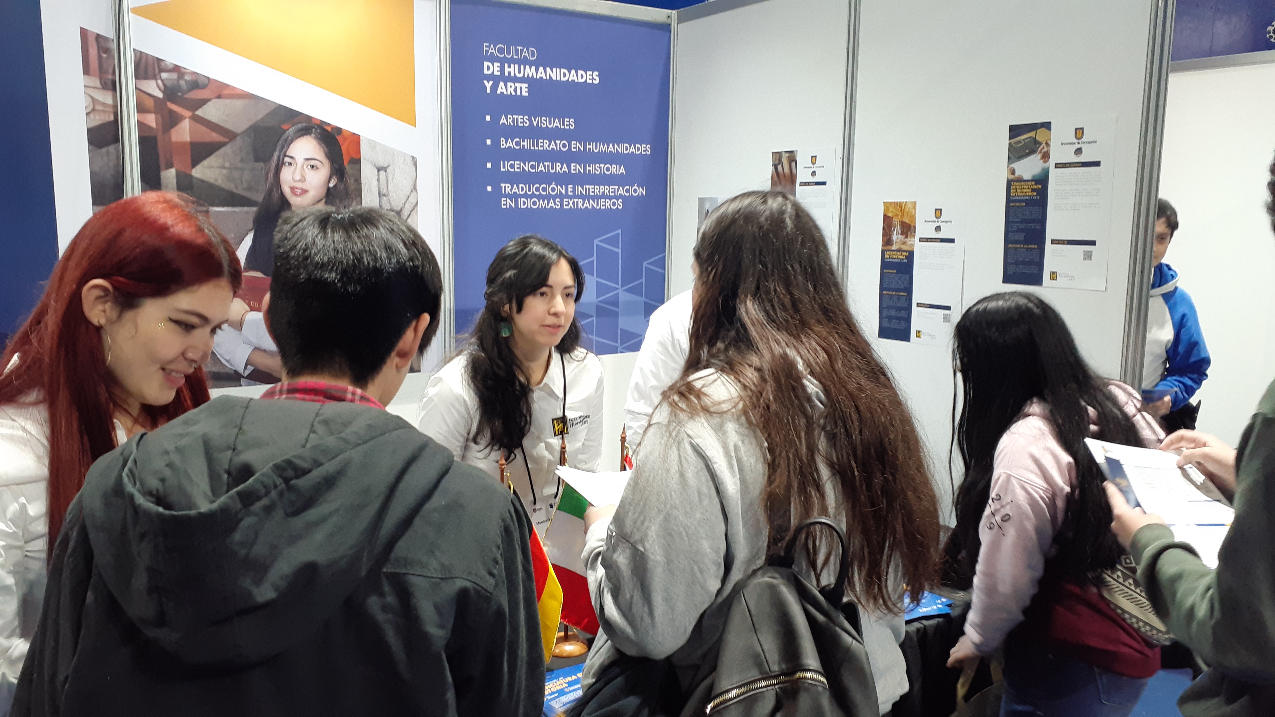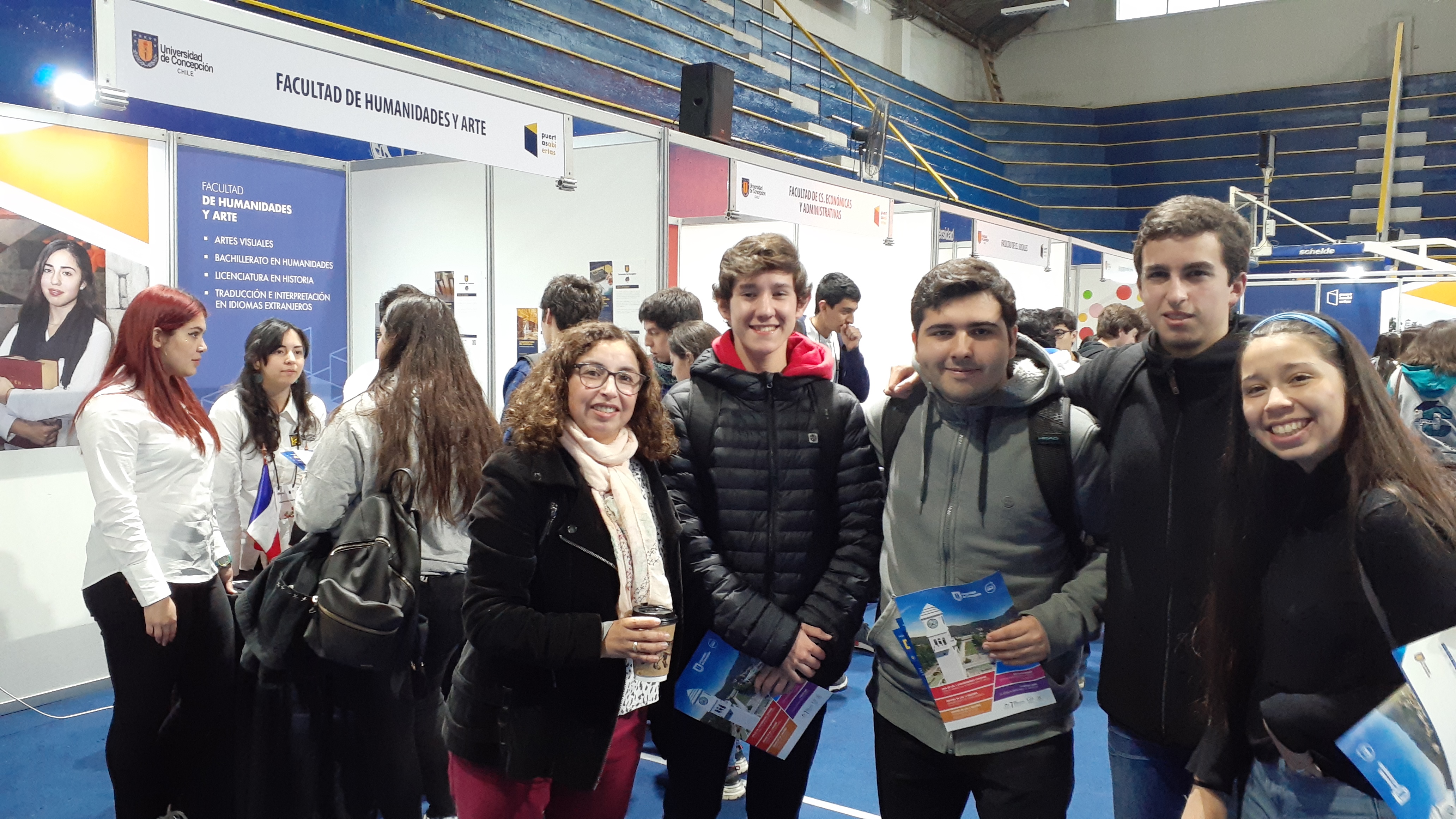 Este jueves 17 y viernes 18 de octubre nuestra Facultad de Humanidades y Arte participa con un stand informativo en la Feria Puertas Abiertas 2019. La actividad se desarrolla en la Casa del Deporte de la UdeC, desde las 9.00 hasta las 18.00 hrs. El equipo de promoción este año está conformado por Raúl Almeida, profesor del Departamento de Música y jefe monitor; Constanza Quijada, alumna de Pedagogía en Música, Javiera San Martín, alumna de Licenciatura en Arte, y María Paz Wallffiguef, alumna de la carrera de Traducción e Interpretación en Idiomas Extranjeros.