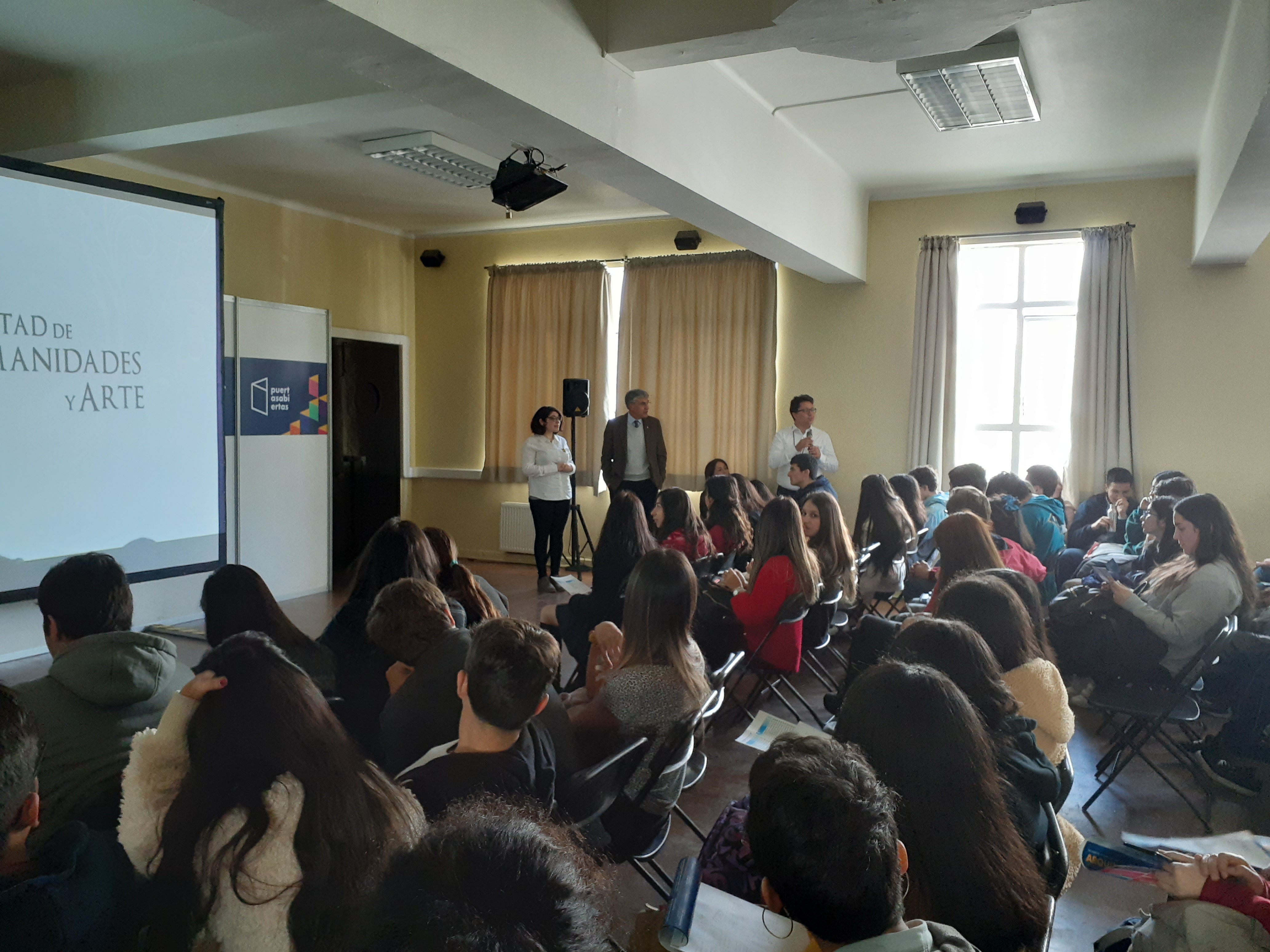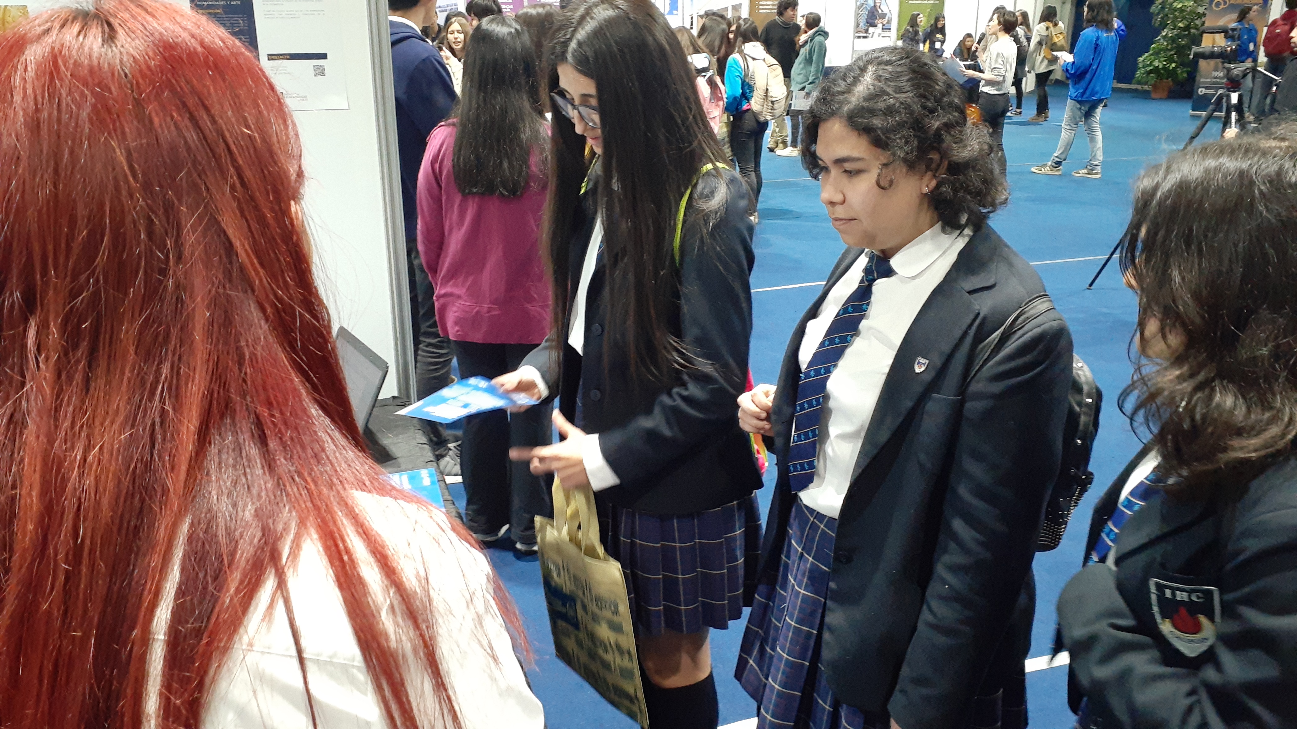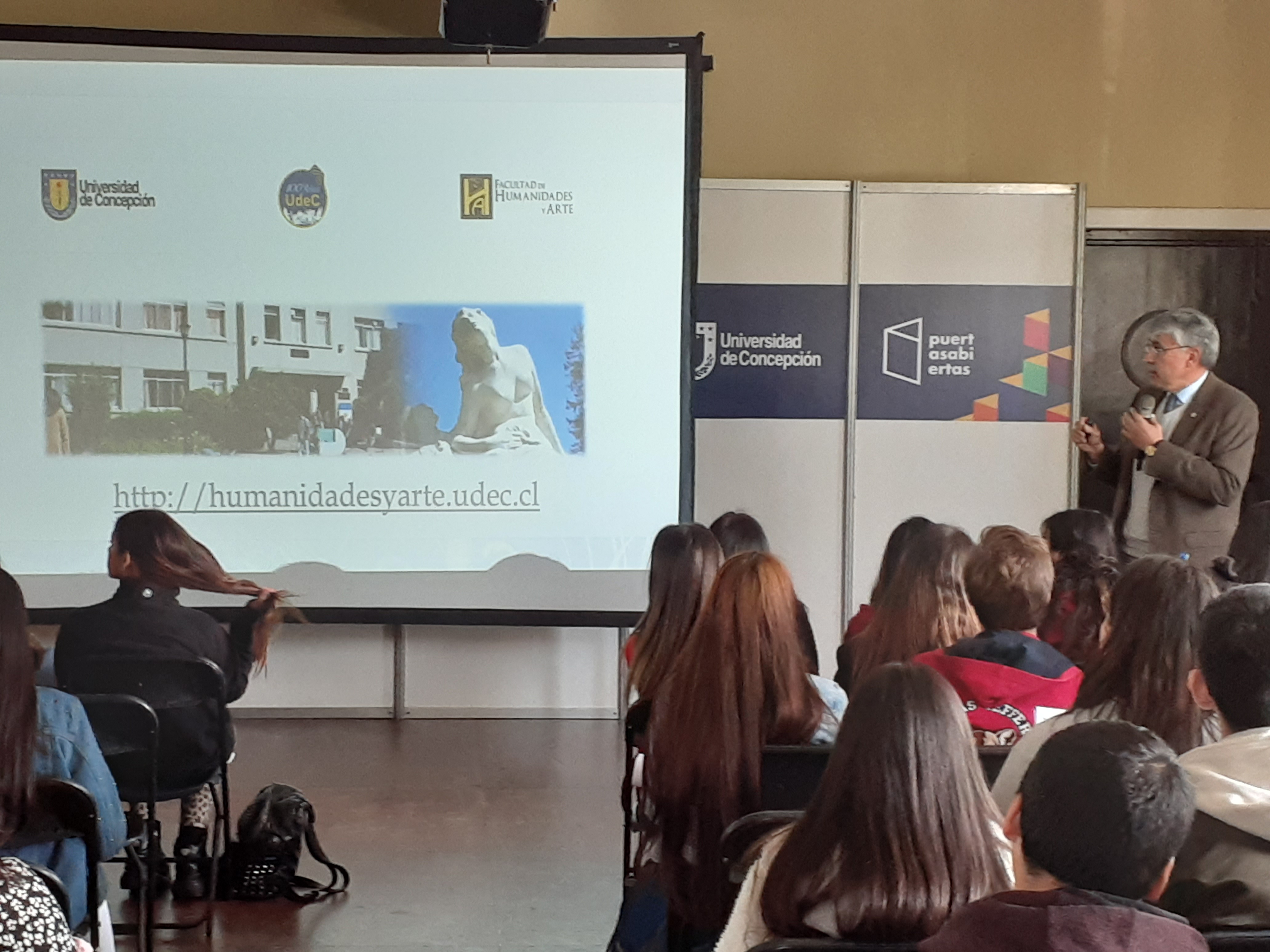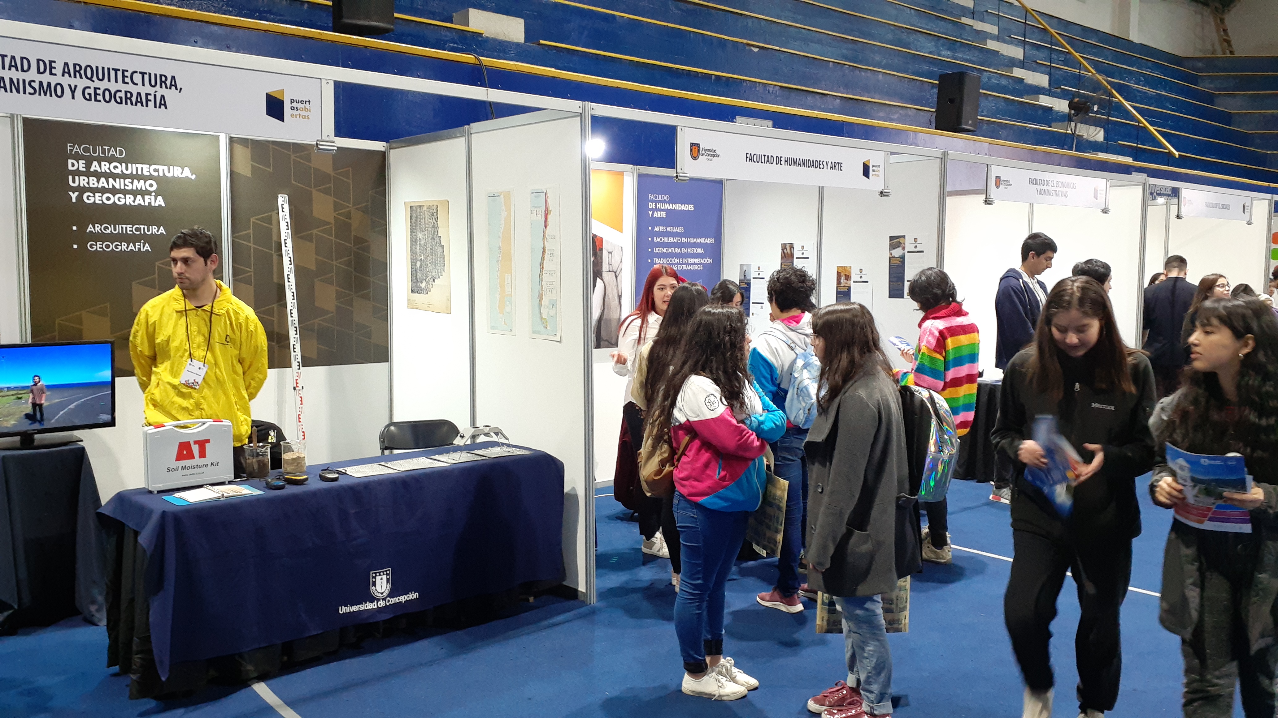 Este jueves 17 y viernes 18 de octubre nuestra Facultad de Humanidades y Arte participa con un stand informativo en la Feria Puertas Abiertas 2019. La actividad se desarrolla en la Casa del Deporte de la UdeC, desde las 9.00 hasta las 18.00 hrs. El equipo de promoción este año está conformado por Raúl Almeida, profesor del Departamento de Música y jefe monitor; Constanza Quijada, alumna de Pedagogía en Música, Javiera San Martín, alumna de Licenciatura en Arte, y María Paz Wallffiguef, alumna de la carrera de Traducción e Interpretación en Idiomas Extranjeros.