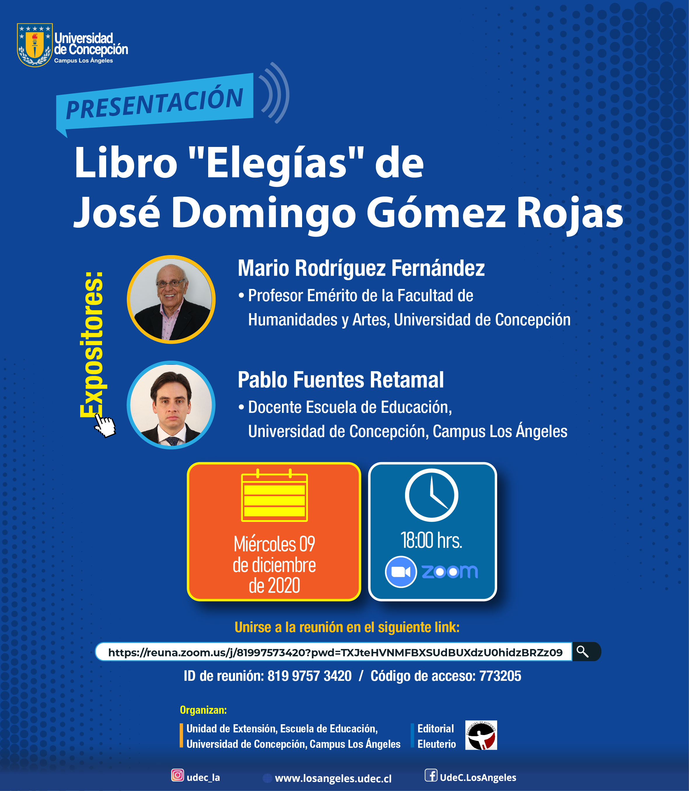 Se informa que este miércoles 9 de diciembre de 2020, se realizará la presentación del libro «Elegías» de José Domingo Gómez Rojas. Exponen los académicos: Mario Rodríguez Fernández, Profesor Emérito de la Facultad de Humanidades y Arte de la UdeC, y Pablo Fuentes Retamal, Docente de la Escuela de Educación, UdeC, Campus Los Ángeles. Desde las 18.00 hrs. Vía Zoom.