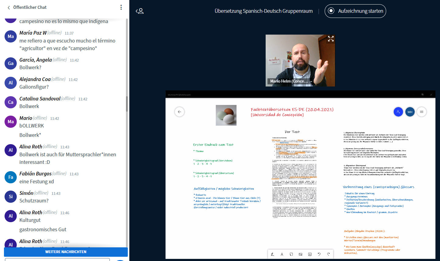 El profesor Mario Helm inició en colaboración con el Instituto de Lingüística Aplicada de la Universität Leipzig (Alemania) un nuevo taller de traducción del español al alemán para nuestras y nuestros estudiantes de la especialidad de alemán de la Carrera de Traducción e Interpretación. Se trata de un primer intento de organizar clases entre las dos instituciones donde pueden participar estudiantes de ambas universidades guiados por el académico de la Universidad de Concepción Mario Helm y el Prof. Dr. Carsten Sinner de la Universität Leipzig. El contenido es la traducción de textos con diferentes grados de especialización sobre agricultura, avicultura, silvicultura y acuicultura, entre otros.