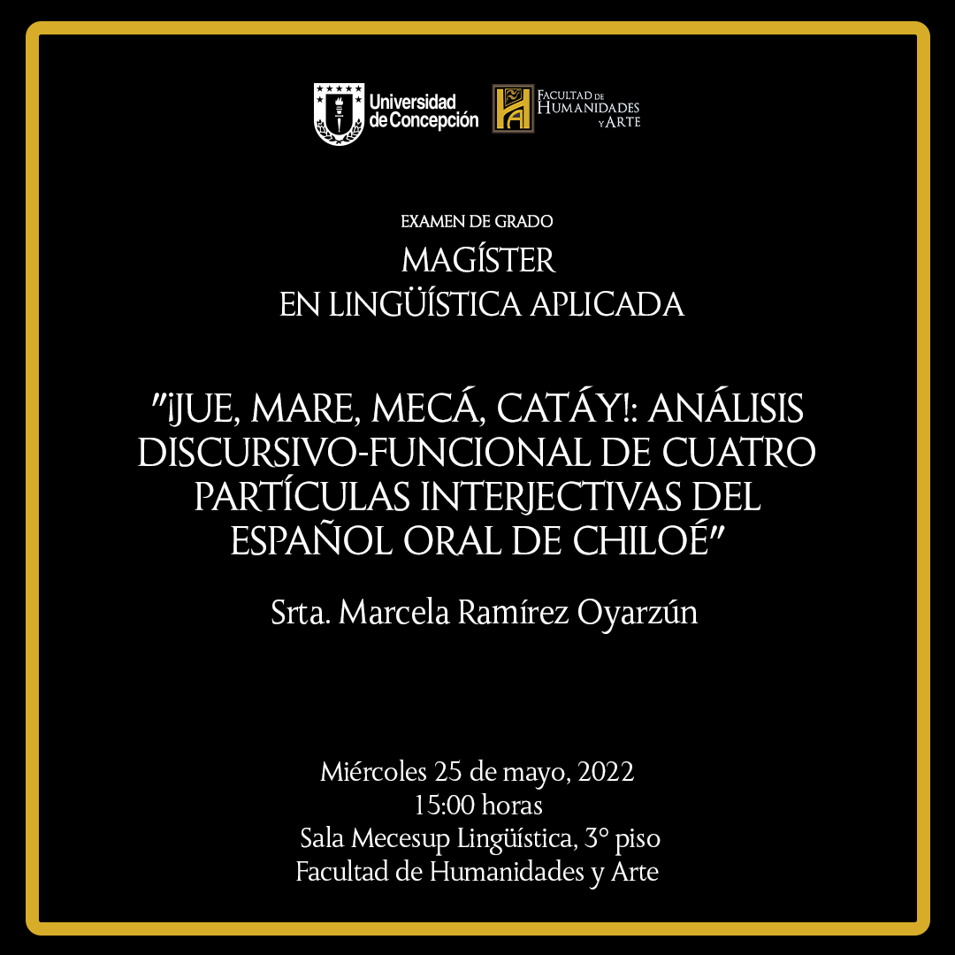Prof. Dr. Daniel Pereira P., Director del Programa de Magíster en Lingüística Aplicada, saluda muy atentamente a usted y tiene el agrado de invitarlo(a) al Examen de Grado de la candidata a Magíster en Lingüística Aplicada Srta. MARCELA RAMÍREZ OYARZÚN. Su Tesis de Grado se titula «¡JUE, MARE, MECÁ, CATÁY!: ANÁLISIS DISCURSIVO-FUNCIONAL DE CUATRO PARTÍCULAS INTERJECTIVAS DEL ESPAÑOL ORAL DE CHILOÉ«.