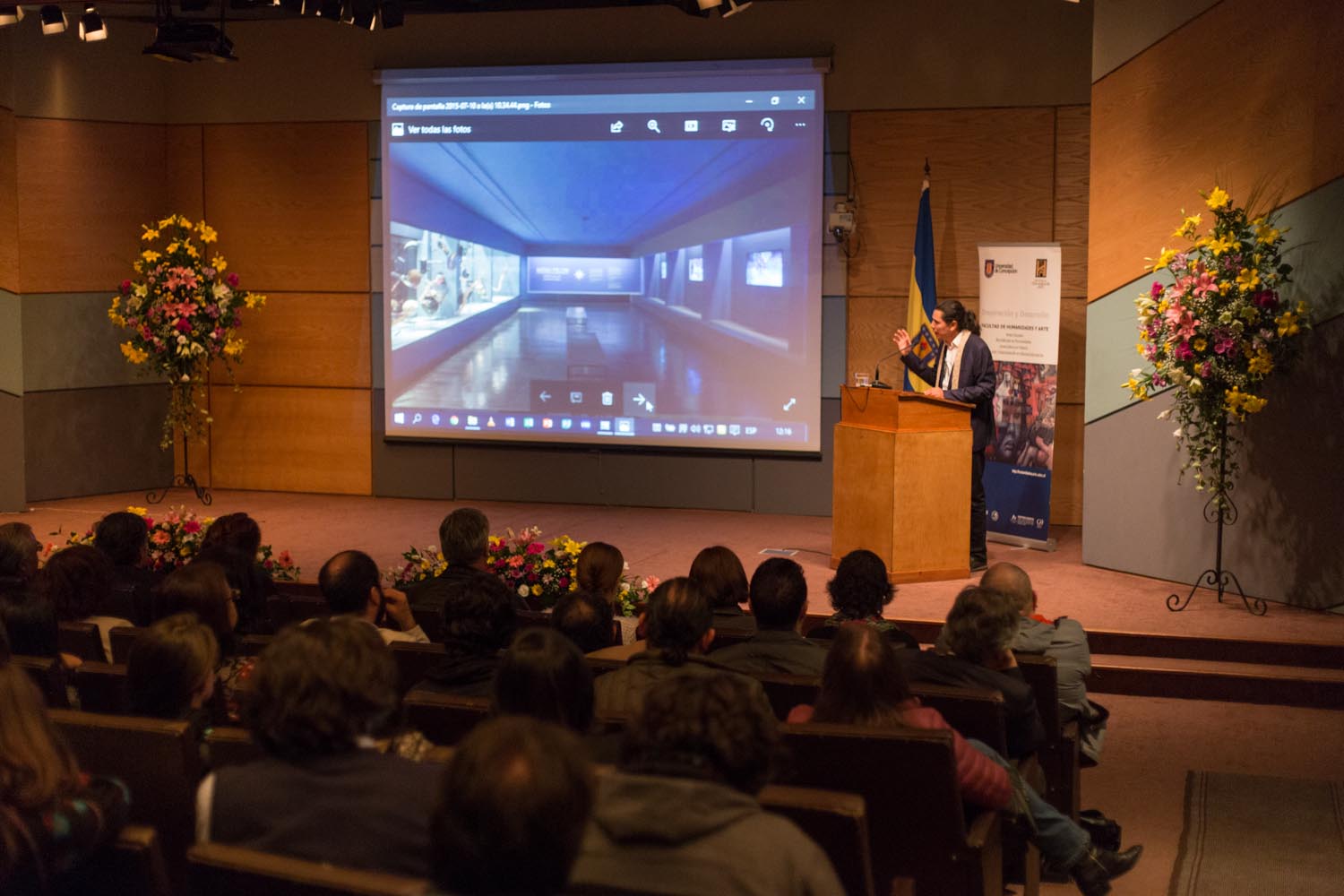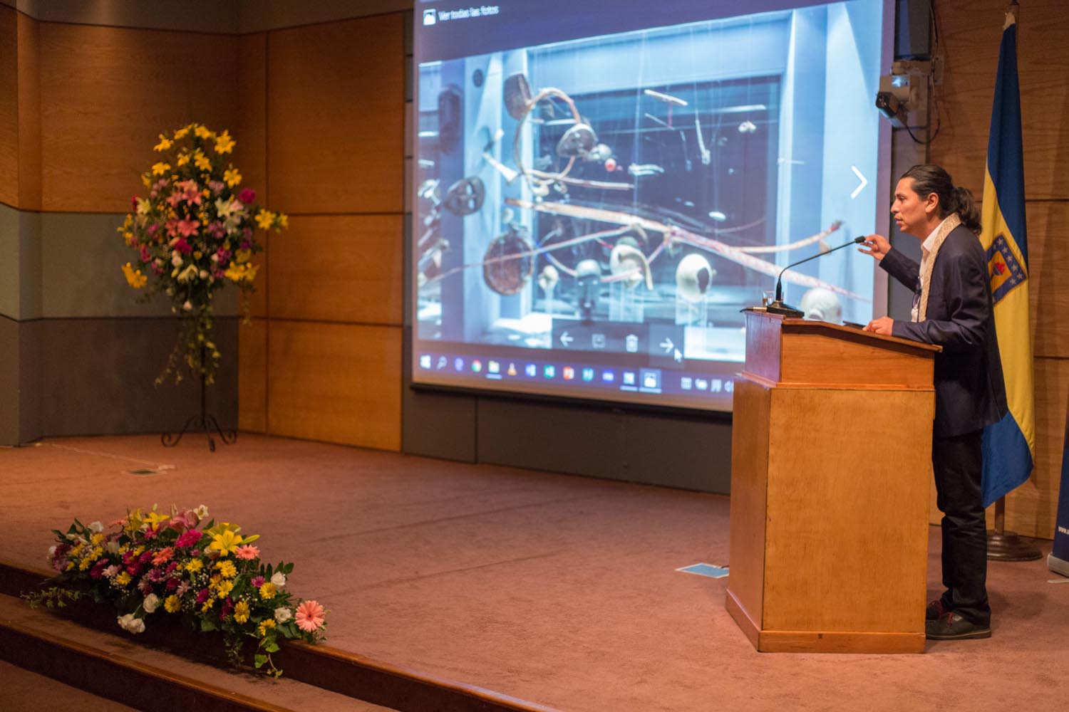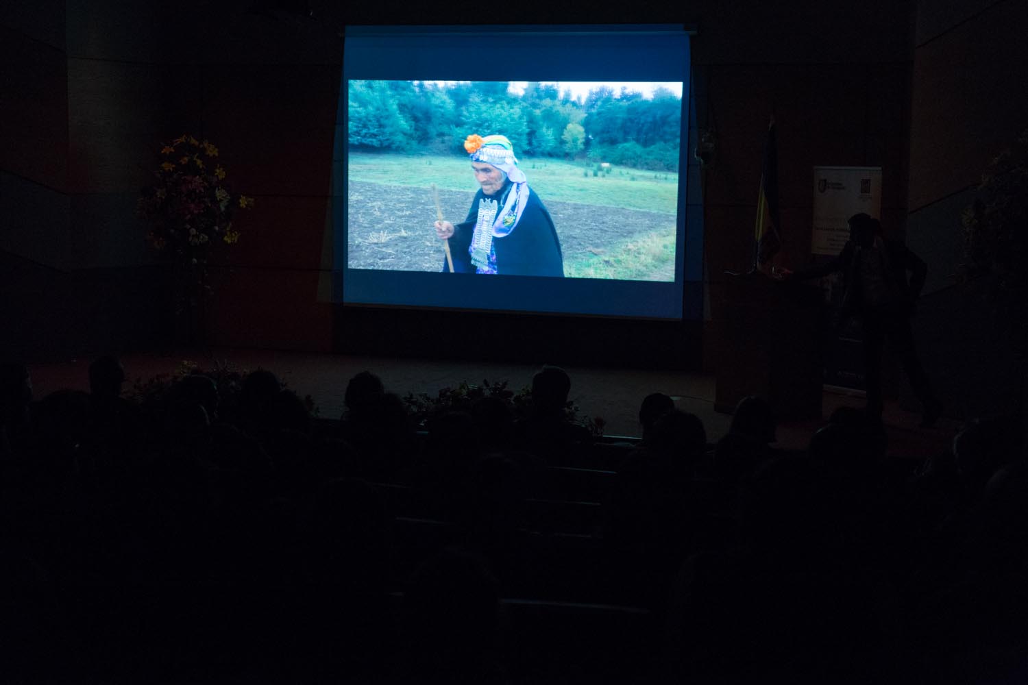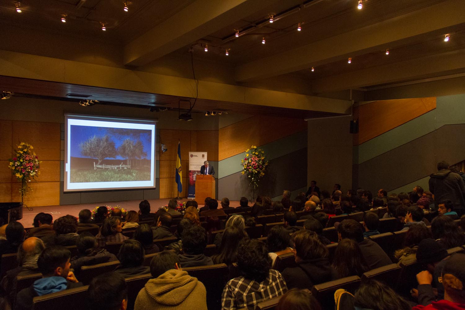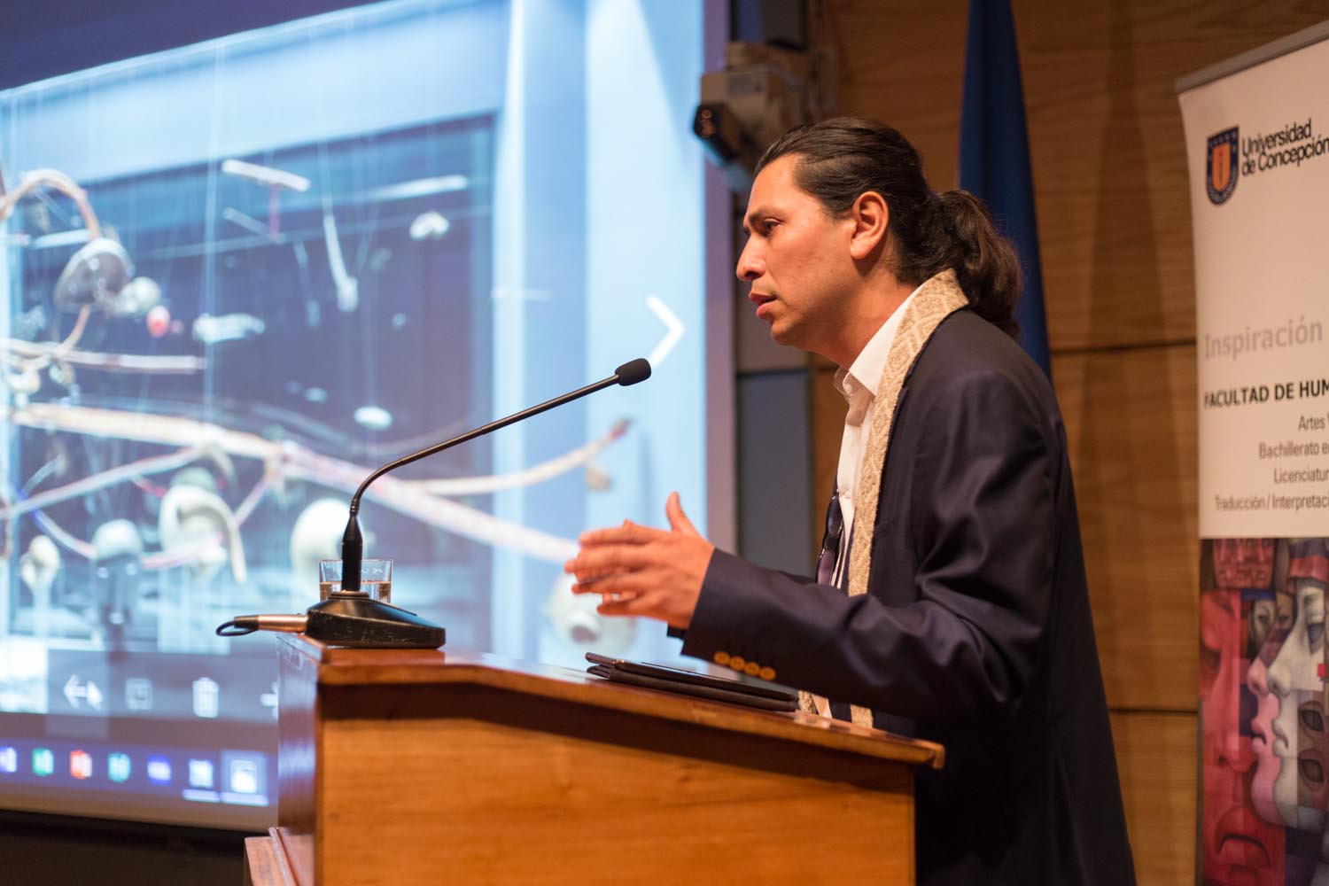 El profesor revisó dos experiencias de arte contemporáneo mapuche que ha desarrollado en los museos de Arte Precolombino y de Artes Visuales, y antes de comenzar señaló «espero corresponder con las palabras que tengan sabiduría y llegar a sus corazones, con esta mezcla de arte y cine». Una de ellas, Wenu Pelon, cumple dos años de exhibición este mes y se transformó así en la muestra más extensa de este tipo en el país. Asimismo, revisó parte de su obra audiovisual y se trazó como objetivo “no hablar tanto desde la academia, sino desde la percepción y las emociones”. El profesor agradeció la invitación, señalando que “estoy llegando a la Universidad y creo que me han dado una muy buena acogida, es un honor que me hayan invitado a hablar desde mi mundo, que es también el de ustedes”.
