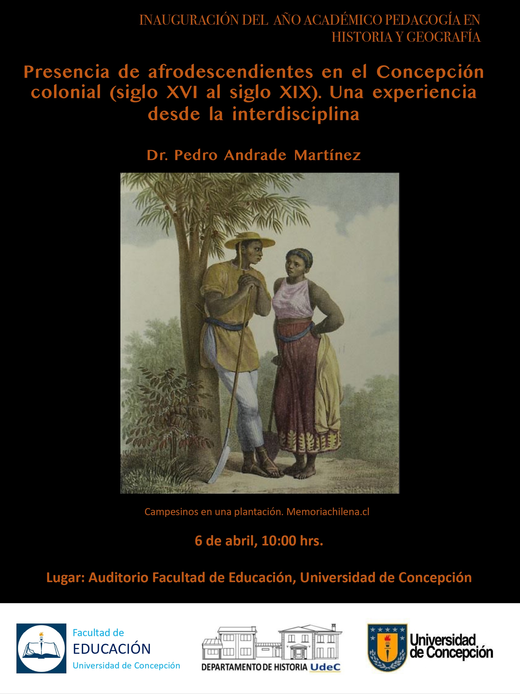 El Departamento de Historia de la UdeC, invita a toda la comunidad universitaria a asistir a la charla de inauguración de año académico 2023 de la carrera de Pedagogía en Historia y Geografía, cuyo título es «Presencia de afrodescendientes en el Concepción colonial (siglo VXI al siglo XIX). Una experiencia desde la interdisciplina», la cual será dictada por el Dr. Pedro Andrade Martínez, académico del Departamento de Historia.