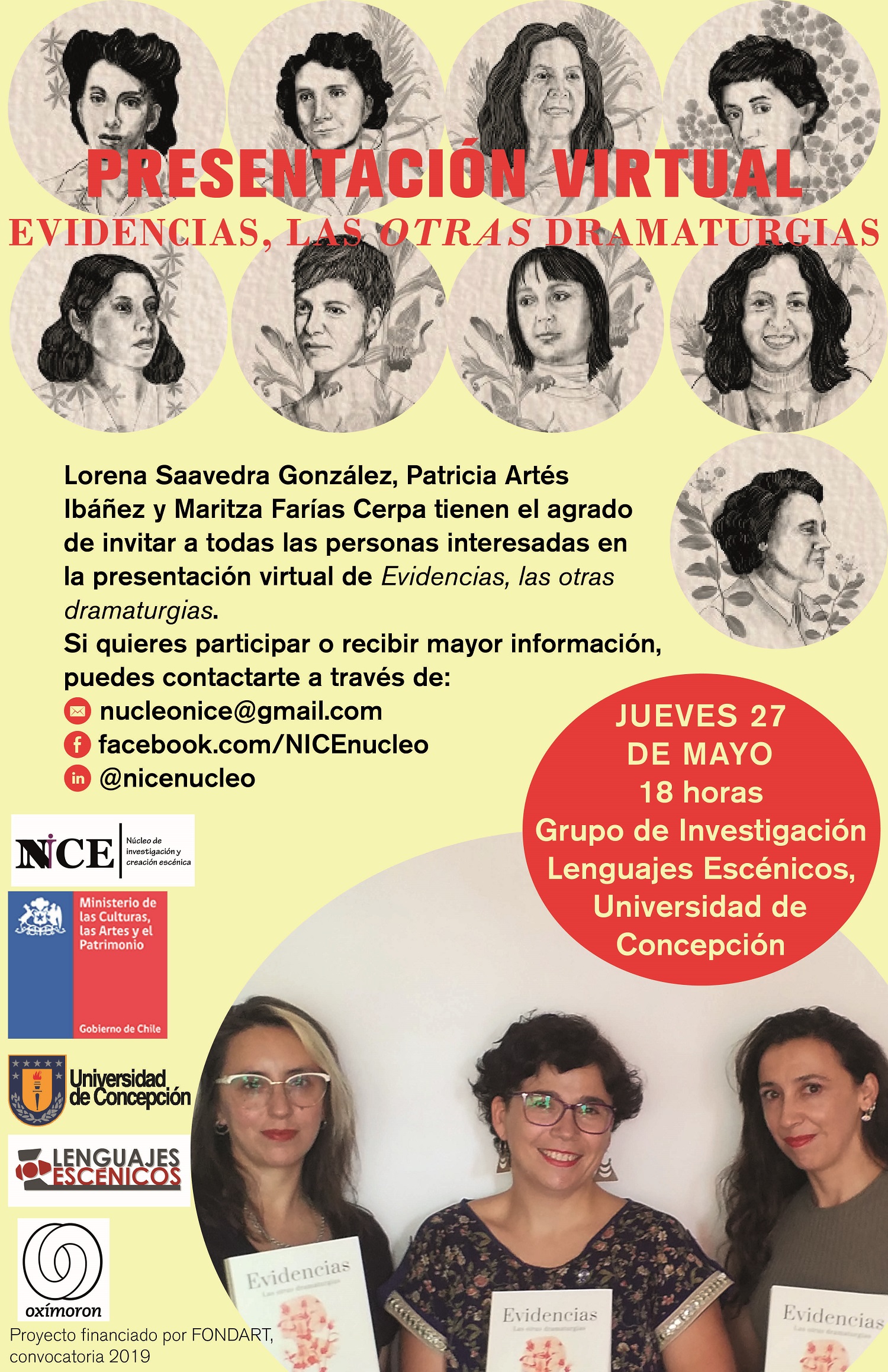 Se informa que este jueves 27 de mayo se realizará la presentación del libro «Evidencias. Las otras dramaturgias», primera antología de dramaturgia de mujeres del siglo XX. En el libro se encuentran 12 obras de teatro escritas entre el 1919 y el año 2000, más un prólogo crítico escrito por integrantes del Núcleo de Investigación y creación escénica, NICE, formado por las actrices Patricia Artés, Lorena Saavedra y Maritza Farías.