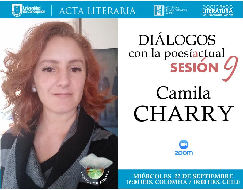 Se informa que Diálogos con la poesía actual contará con la presencia, en su novena sesión, de la poeta, editora y profesora Camila Charry, quien ofrecerá una lectura de sus poemas y dialogará con los asistentes. Camila Charry ha publicado los libros de poesía Detrás de la bruma, El día de hoy, Otros ojos, El sol y la carne, Arde Babel (re-editado en Guatemala y en México en los años 2018 y 2019 respectivamente), y el libro Materia iluminada, poesía escogida, edición bilingüe, español-francés (2019). Es co-editora del fanzine La trenza, que aborda la poesía y el ensayo escritos por mujeres en Colombia, y asistente editorial de la Biblioteca de Escritoras Colombianas en el Ministerio de Cultura y de la Corporación Élite. Algunos de sus poemas han sido traducidos al inglés, francés, rumano, polaco, portugués, árabe e italiano.