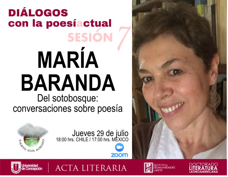 Diálogos con la poesía actual contará con la presencia, en su séptima sesión, de la destacada poeta, narradora y traductora mexicana María Baranda, quien ofrecerá la conferencia “Del sotobosque: conversaciones sobre poesía” y una lectura de sus poemas. María Baranda ha escrito, entre otros libros de poesía, El jardín de los encantamientos (1989), Fábula de los perdidos (1990), Los memoriosos (1995), Moradas imposibles (1997), Nadie, los ojos (1999), Narrar (2001), Atlántica y El Rústico (2002), Dylan y las ballenas (2003), Ficticia (2006), Arcadia (2010), Yegua nocturna corriendo en un prado de luz absoluta (2013), Un hervidero de pájaros marinos (2015) y Teoría de las niñas (2017). La Universidad Nacional Autónoma de México publicó su poesía escogida bajo el título de El mar insuficiente. Poesía (1989-2009). Ha recibido los premios de poesía Punto de Partida en 1986; Amado Nervo en 1988; Efraín Huerta en 1995; Villa de Madrid, España en 1998; el Premio Nacional de Poesía Aguascalientes en 2003; el Premio Internacional de Poesía Sabines-Gatien Lapointeen Canadá en 2015; y el Internacional de Poesía Ramón López Velarde por su trayectoria en 2018. La Universidad de Yale recientemente publicó su libro New WorldWritten. Select Poems y Milkweed Editions, la traducción de la poesía de San Juan de la Cruz al inglés que realizó con Paul Hoover. Ha trabajado con diversos artistas como Magali Lara, Vicente Rojo y la compositora Gabriela Ortiz. Libros suyos han sido publicados en Bélgica, Canadá, Estados Unidos, China, Italia e Inglaterra y sus poemas han sido traducidos a diversos idiomas. Actualmente es la tutora de poesía en la Fundación para las Letras Mexicanas.