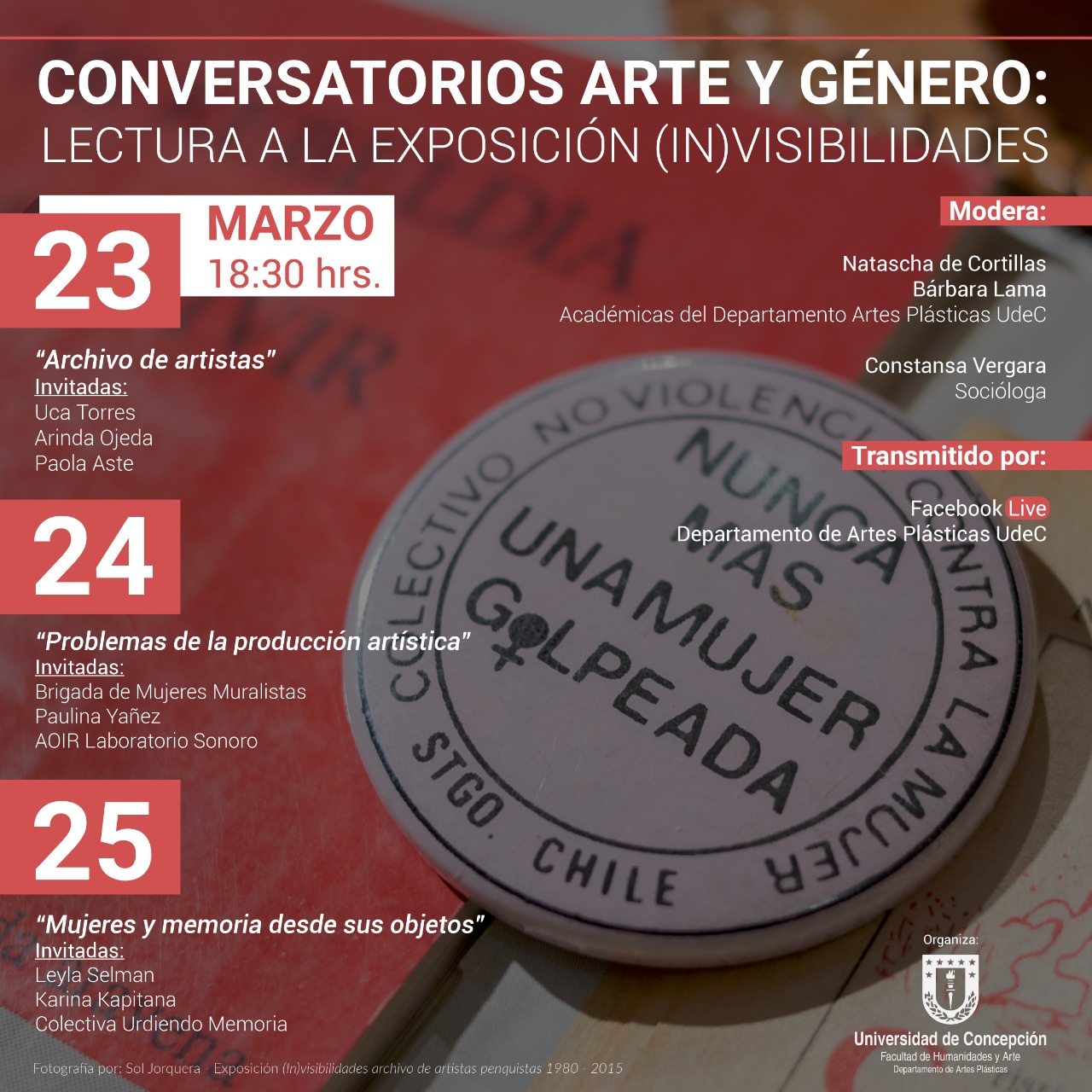El ciclo de conversatorios, busca generar un espacio de diálogo y reflexión conjunta en torno a la problemática del archivo y las mujeres en la escena artística penquista en el marco de la exposición (In)Visibilidades. Esta iniciativa, inscrita dentro de la exposición sobre archivo del Departamento de Artes Plásticas de la Universidad de Concepción, también se enmarca dentro de las actividades conmemorativas del 8 de marzo. Mes que durante los últimos años se posiciona internacionalmente a través de masivas movilizaciones que visibilizan y articulan las diversas demandas exigidas por mujeres y disidencias.
