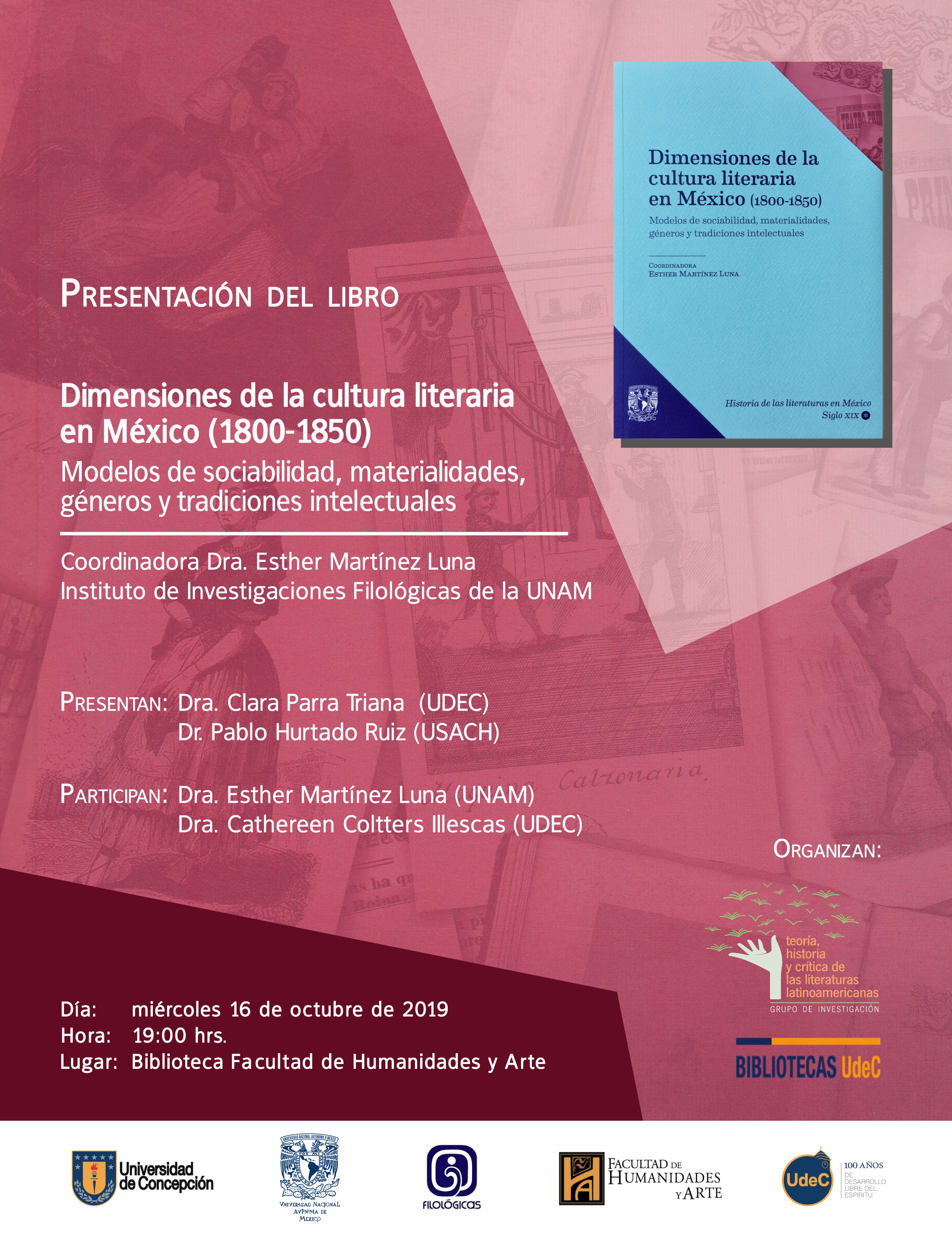 El Grupo de Investigación de Teoría, Historia y Crítica de las Literaturas Latinoamericanas, en el marco de las actividades del centenario de la UdeC, invita a toda la comunidad a asistir a la presentación del libro «Dimensiones de la cultura literaria en México (1800-1850). Modelos de sociabilidad, materialidades, géneros y tradiciones intelectuales» (2018), volumen coordinado por la Dra. Esther Martínez Luna, investigadora del Instituto de Investigaciones Filológicas de la UNAM, y en el que participó como una de las co-autoras, la Dra. Cathereen Coltters Illescas, docente del Departamento de Español de la Facultad de Humanidades y Arte.