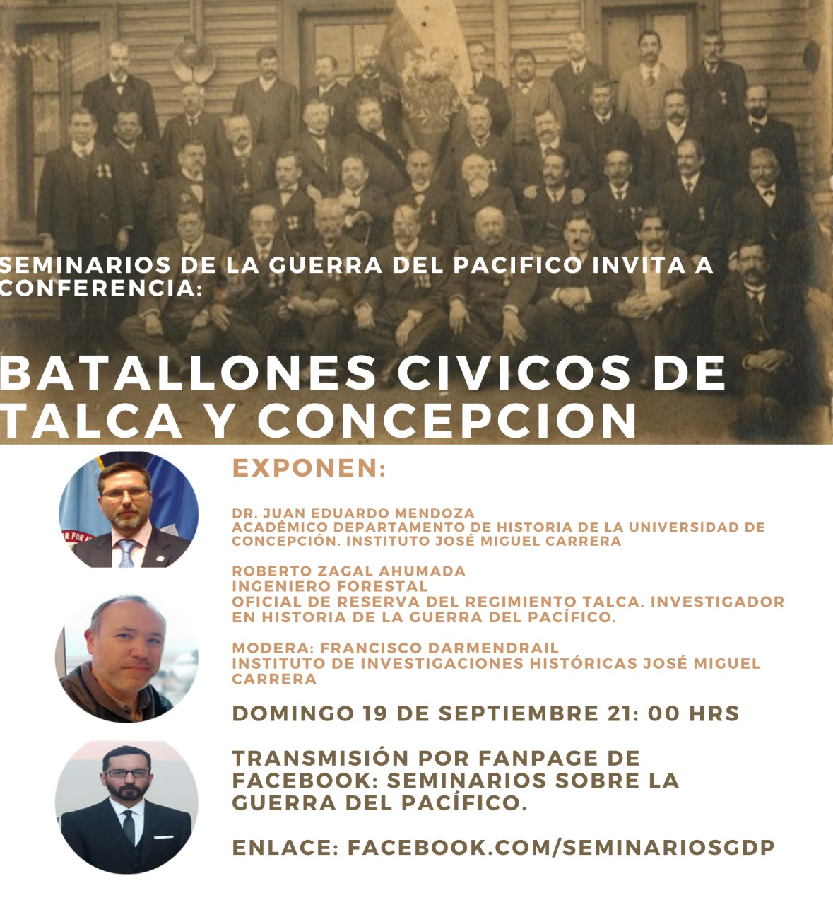 En el marco de la celebración de Fiestas Patrias, el Dr. Juan Eduardo Mendoza, docente del Departamento de Historia de la Facultad de Humanidades y Arte de la Universidad de Concepción, y Francisco Darmendrail, periodista egresado de la citada casa de estudios, ambos integrantes del Instituto de Investigaciones Históricas José Miguel Carrera, organizan el seminario: “Batallones Cívicos de Talca y Concepción”