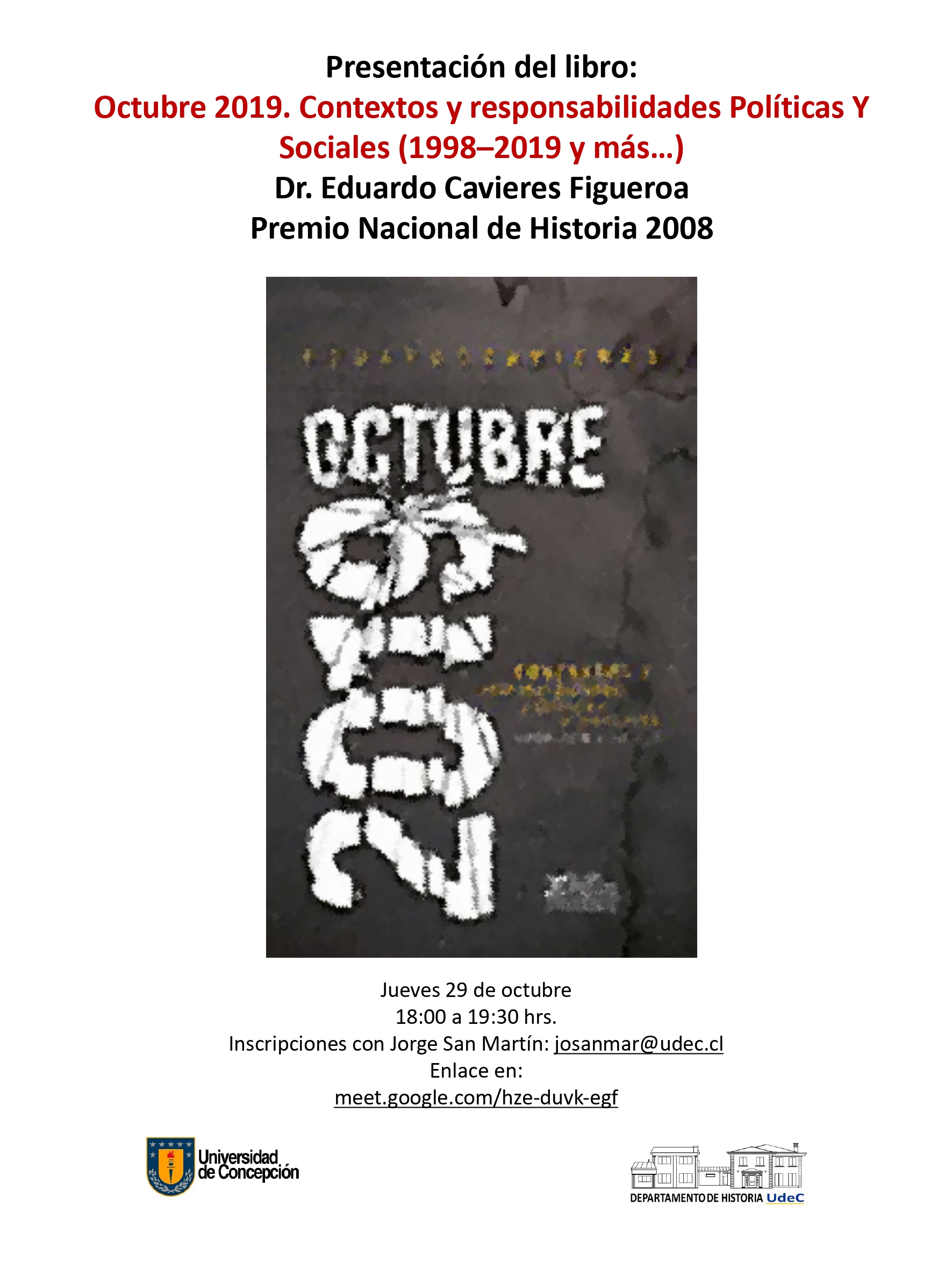 El Departamento de Historia, de la Facultad de Humanidades y Arte, invita a la comunidad universitaria y en general, a la presentación del libro «Octubre 2019. Contextos y Responsabilidades Políticas y Sociales (1998-2019 y Más), del Dr. Eduardo Cavieres Figueroa, Premio Nacional de Historia 2008.