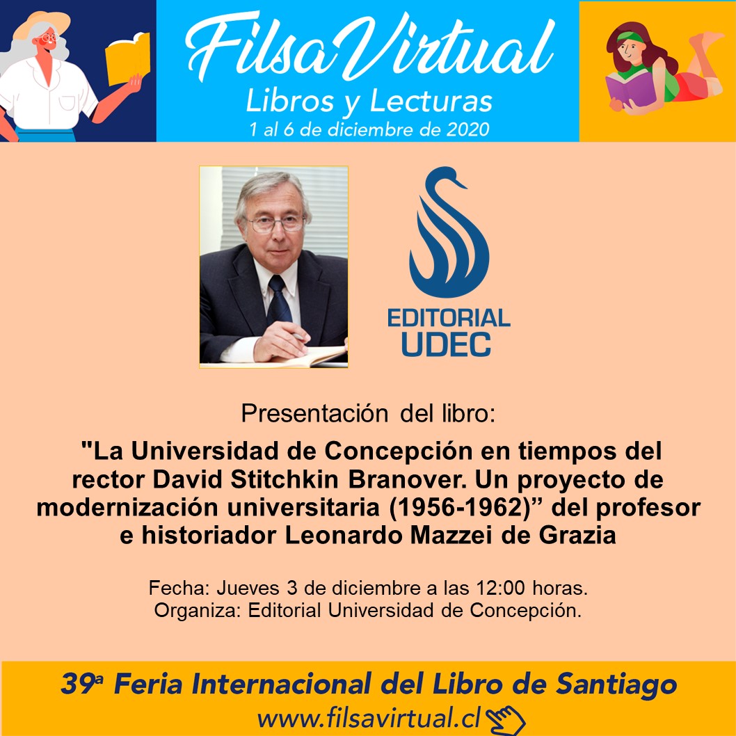 El Departamento de Historia, de la Facultad de Humanidades y Arte, invita a la presentación del libro «La Universidad de Concepción en tiempos del rector David Stitchkin Branover. Un proyecto de modernización universitaria (1956-1962)», del profesor e historiador, Leonardo Mazzei de Grazia, en el marco de la 39° Feria Internacional del Libro de Santiago (Filsa).