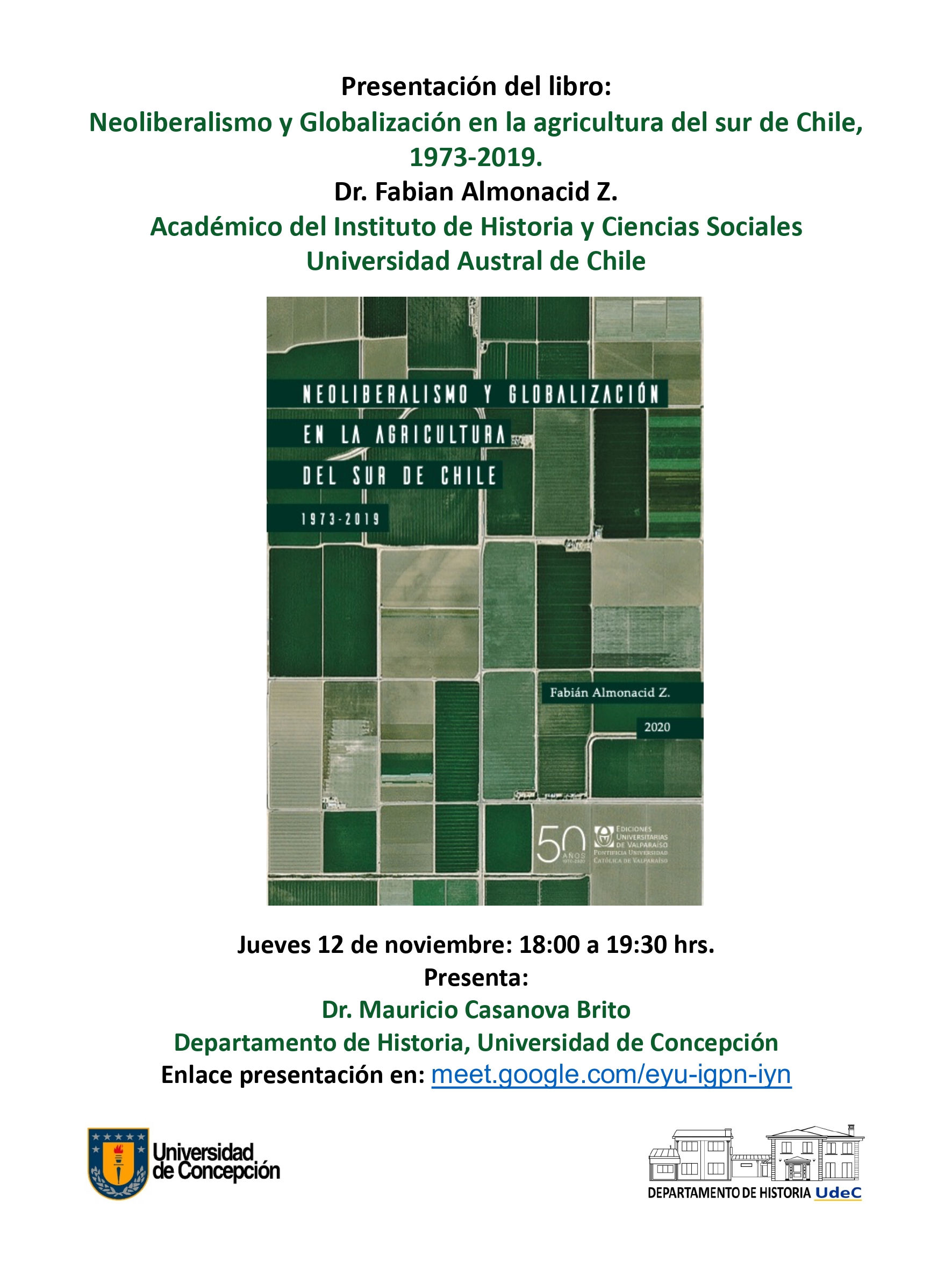 Este jueves 12 de noviembre se llevó a cabo la presentación del libro: «Neoliberalismo y Globalización en la agricultura del sur de Chile, 1973-2019», del Dr. Fabián Almonacid, académico del Instituto de Historia y Ciencias Sociales de la Universidad Austral. La actividad fue organizada por la Dirección del Departamento de Historia, de la Facultad de Humanidades y Arte, de la UdeC.