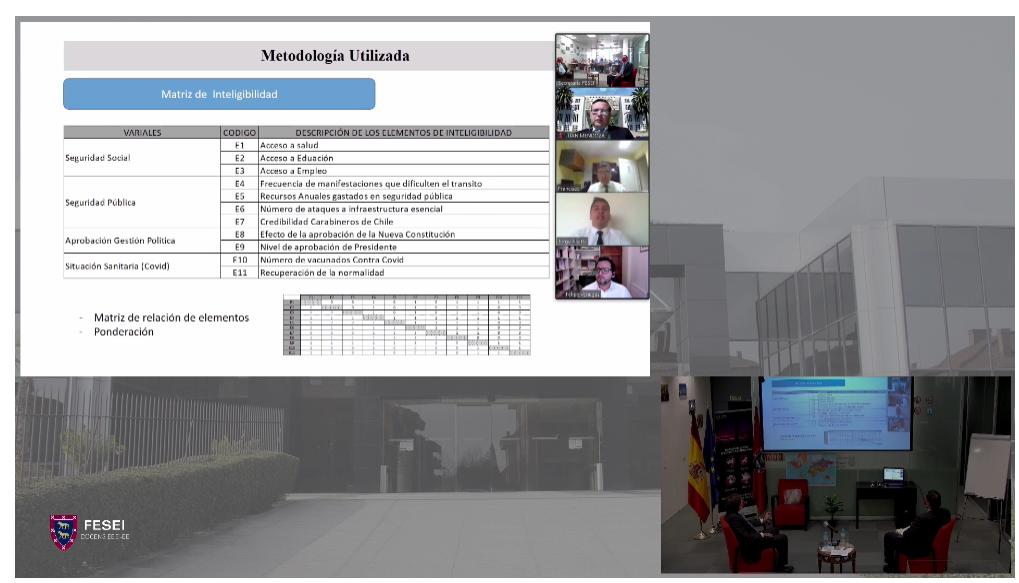 El día martes 20, los asistentes a la Escuela Internacional de Verano abordaron temas de Inteligencia Prospectiva Estratégica, iniciando con un ejemplo de un área de interés vital para España como es Sahel-Magreb. Finalmente, la jornada se completó con la intervención del Dr. Juan Eduardo Mendoza, profesor de la Facultad de Humanidades y Arte de la Universidad de Concepción, quien, junto al Profesor de Prospectiva, Dr. Mario Puig de la ANEPE y un grupo de alumnos del Diplomado de Análisis de Inteligencia Político-Estratégico, analizaron la situación de Chile a partir del 18 de octubre del 2019 y los posibles escenarios futuros contemplados en el proceso constituyente. “En la oportunidad – comenta el Profesor Mendoza – se explicó un trabajo practico de Inteligencia Prospectiva que realizado en clases por los alumnos y que llamo mucho la atención por la metodología empleada”. Por otra parte, el académico y coordinador del Diplomado que dicta en Formación Permanente UdeC, señaló que este tipo de actividades son muy positivas para internacionalizar el programa que ya cuenta con dos alumnos mexicanos y que para la próxima versión ya hemos recibido interesados de países de América Latina y Europa.