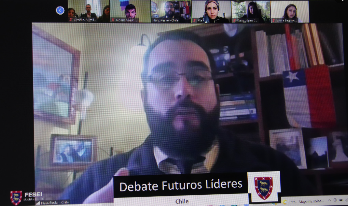 Además, el egresado de Derecho de la UdeC, Hans Reske Ulloa, ayudante del Diplomado de Análisis Inteligencia, participó en el debate de Jóvenes Líderes en el que junto con jóvenes de Azerbaiyán, Francia, Israel, Costa Rica, Siria y España. Donde cada participante explicó la realidad de su país en los ámbitos sociales, económicos y políticos, identificando también los principales desafíos de futuro y ofreciendo posibles soluciones. Según señala Hans «Fue un verdadero honor poder representar a Chile y a la Universidad de Concepción en esta instancia. Se me pidió explayarme sobre el conflicto en La Araucanía, las problemáticas medioambientales, pero sobre todo referirme al Proceso Constituyente que estamos viviendo. A cada joven representante se le solicitó referirse a las cuestiones políticas más urgentes de sus países y fue muy interesante, por ejemplo, escuchar la perspectiva de la Guerra de Nagorno-Karabaj, entre Armenia y Azerbaiyán, de labios de una joven politóloga azerí”