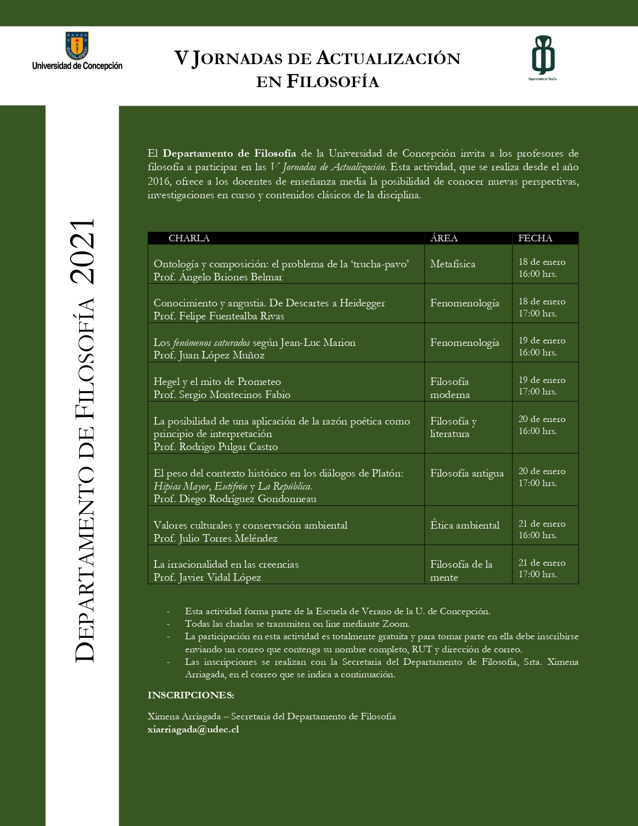 Desde el Departamento de Filosofía se informa que entre 18 al 21 de enero próximos se realizarán las V Jornadas de Actualización en Filosofía (JAF2021).
