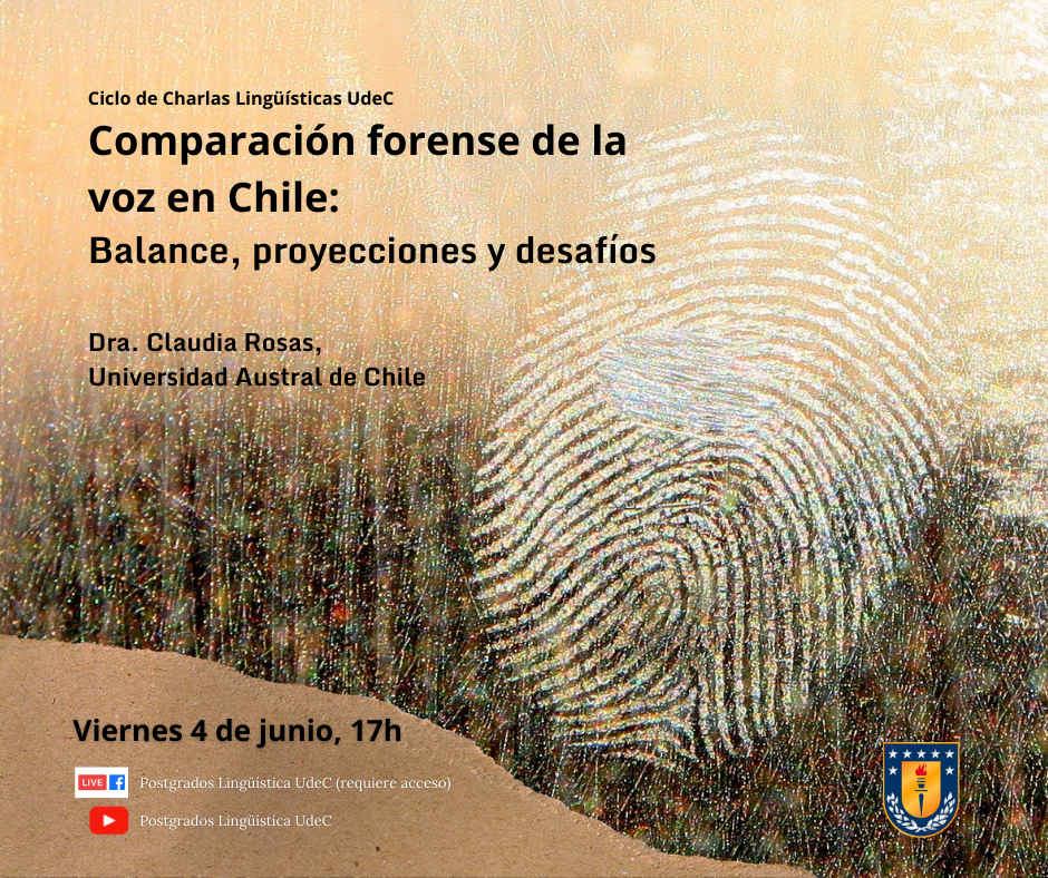 Este viernes 4 de junio se llevará a cabo el ciclo de charlas lingüísticas UdeC, en esta oportunidad se realizará la charla titulada «Comparación forense de la voz en Chile: Balance, proyecciones y desafíos» a cargo de la Dra. Claudia Rosas, docente de la Universidad Austral de Chile.