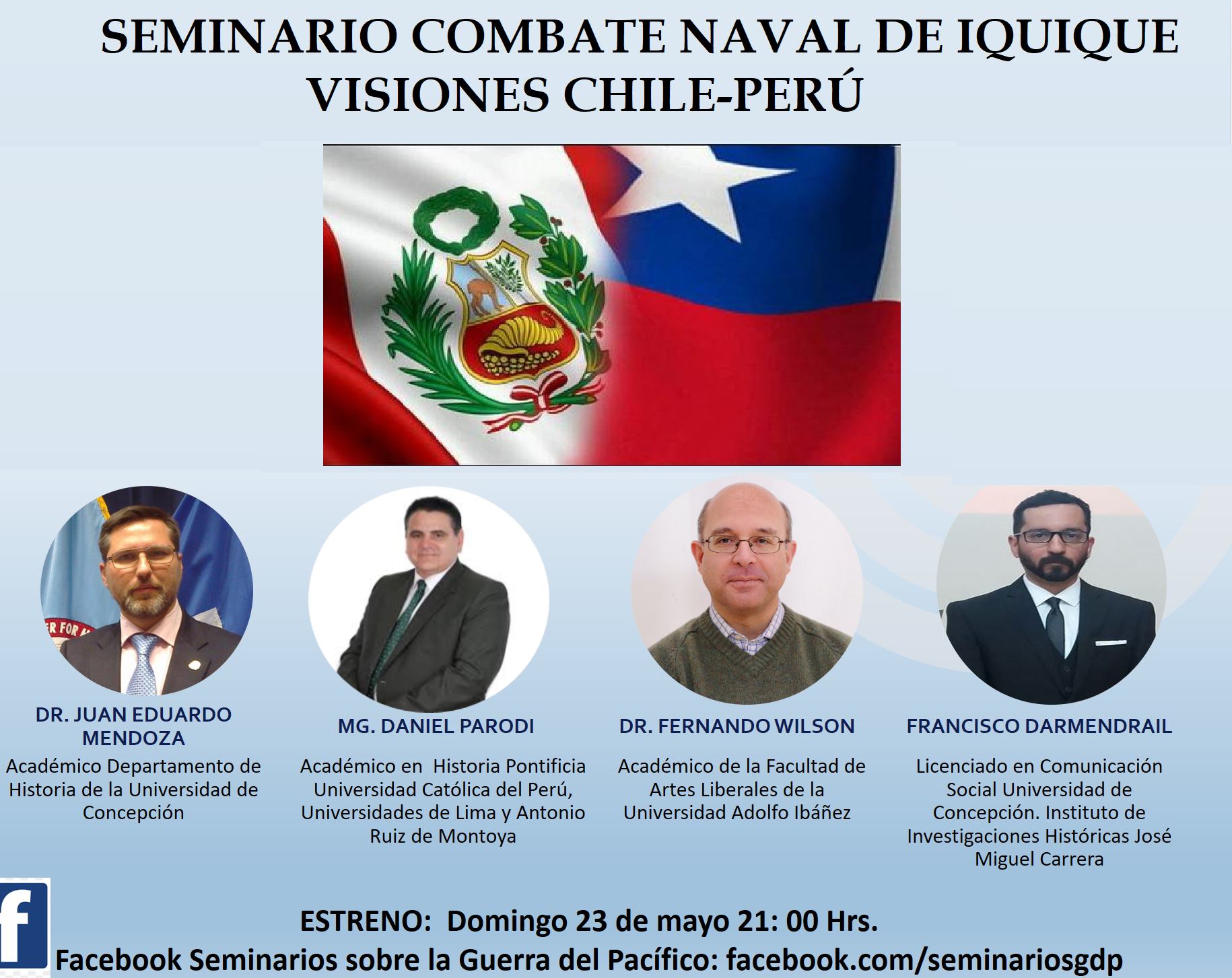 La transmisión se realizará el domingo 23 de mayo a las 21: 00 Hrs. por el sitio Seminarios sobre la Guerra del Pacífico en Facebook: https://www.facebook.com/seminariosgdp